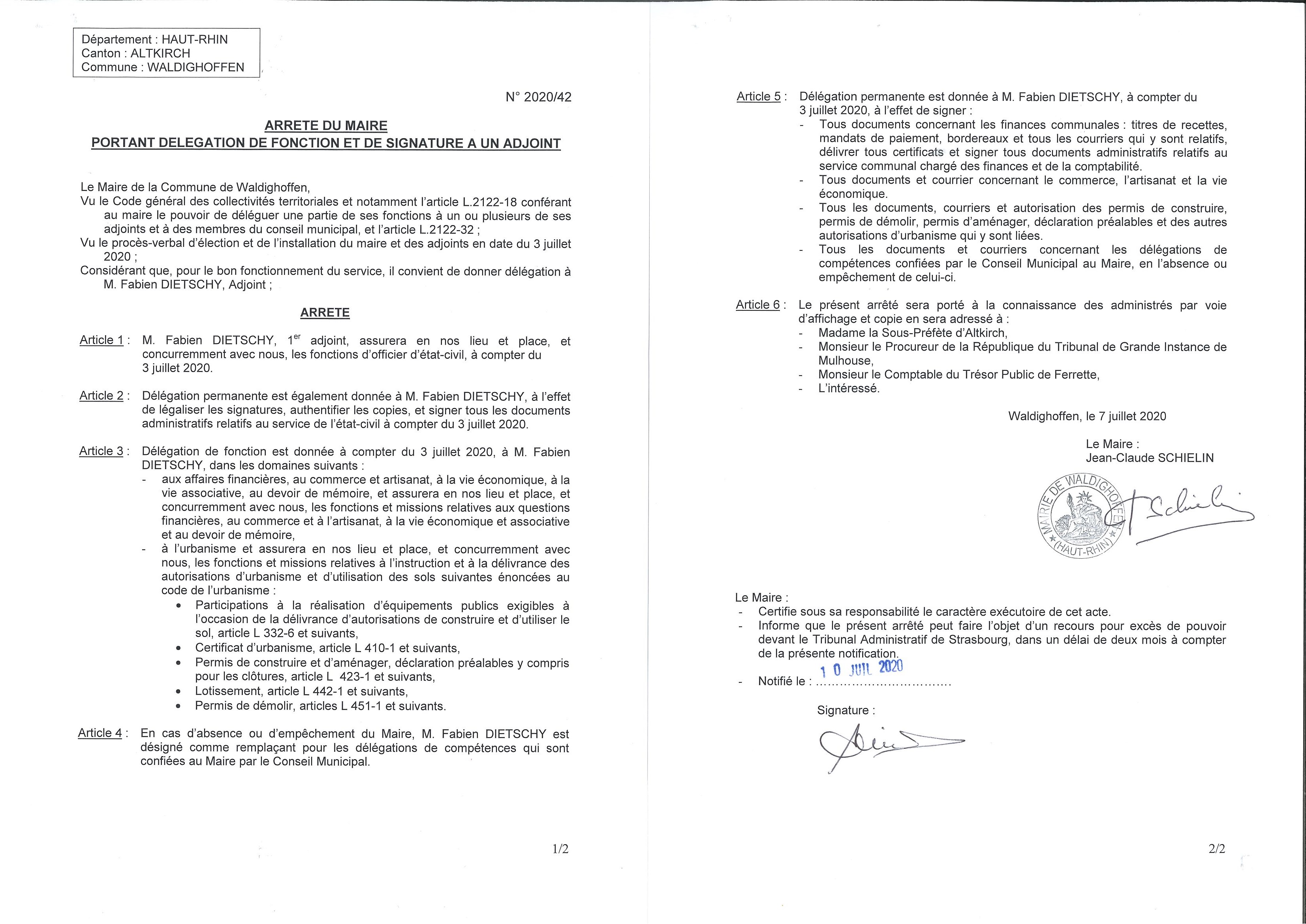 Vous êtes ici : Accueil Mairie Affichage public Annexes affichage public 2020 Arrêté du Maire : délégation pour M. DIETSCHY Fabien
