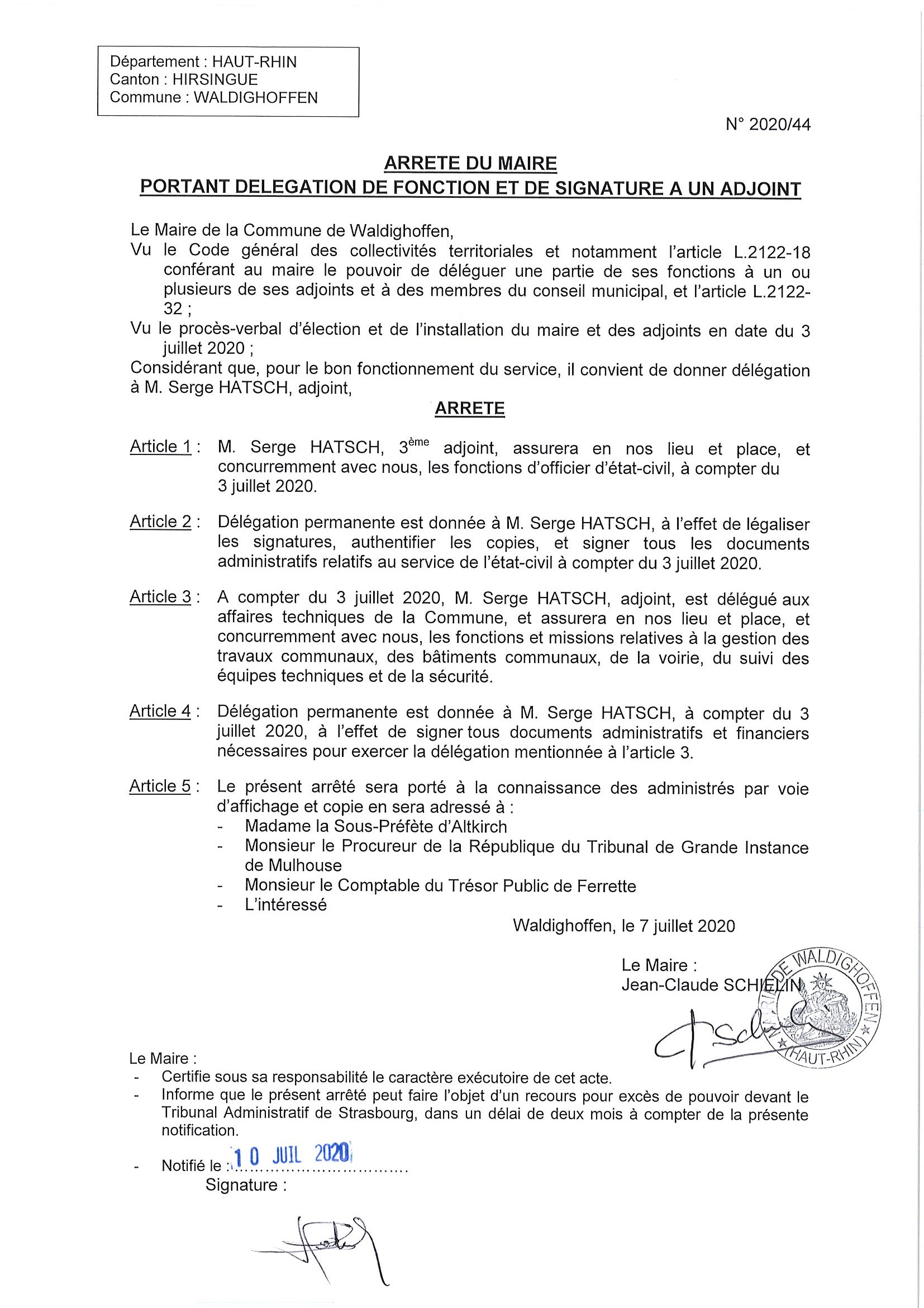 Vous êtes ici : Accueil Mairie Affichage public Annexes affichage public 2020 Arrêté du Maire : délégation pour M. HATSCH Serge