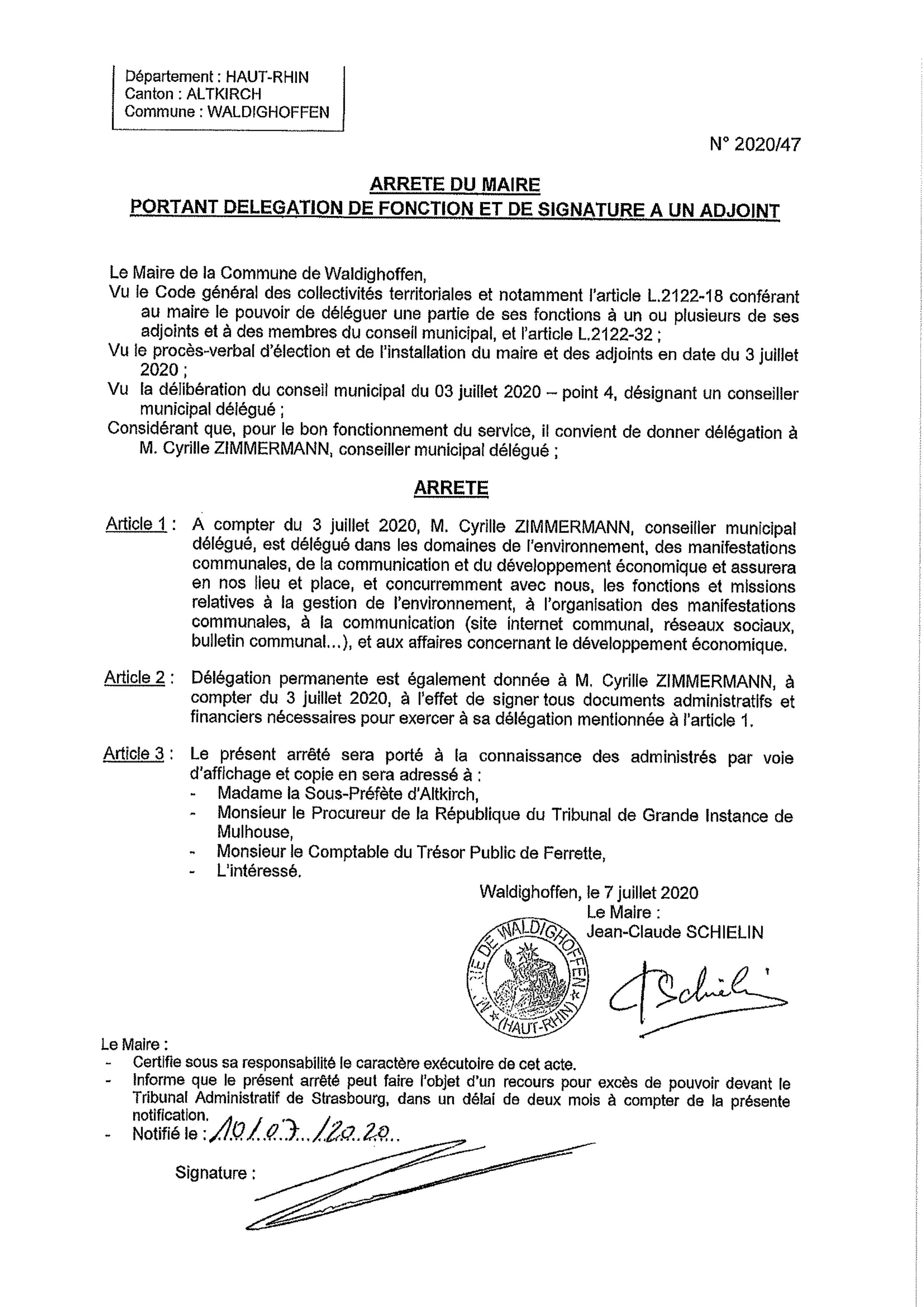 Vous êtes ici : Accueil Mairie Affichage public Annexes affichage public 2020 Arrêté du Maire : délégation pour M. ZIMMERMANN Cyrille