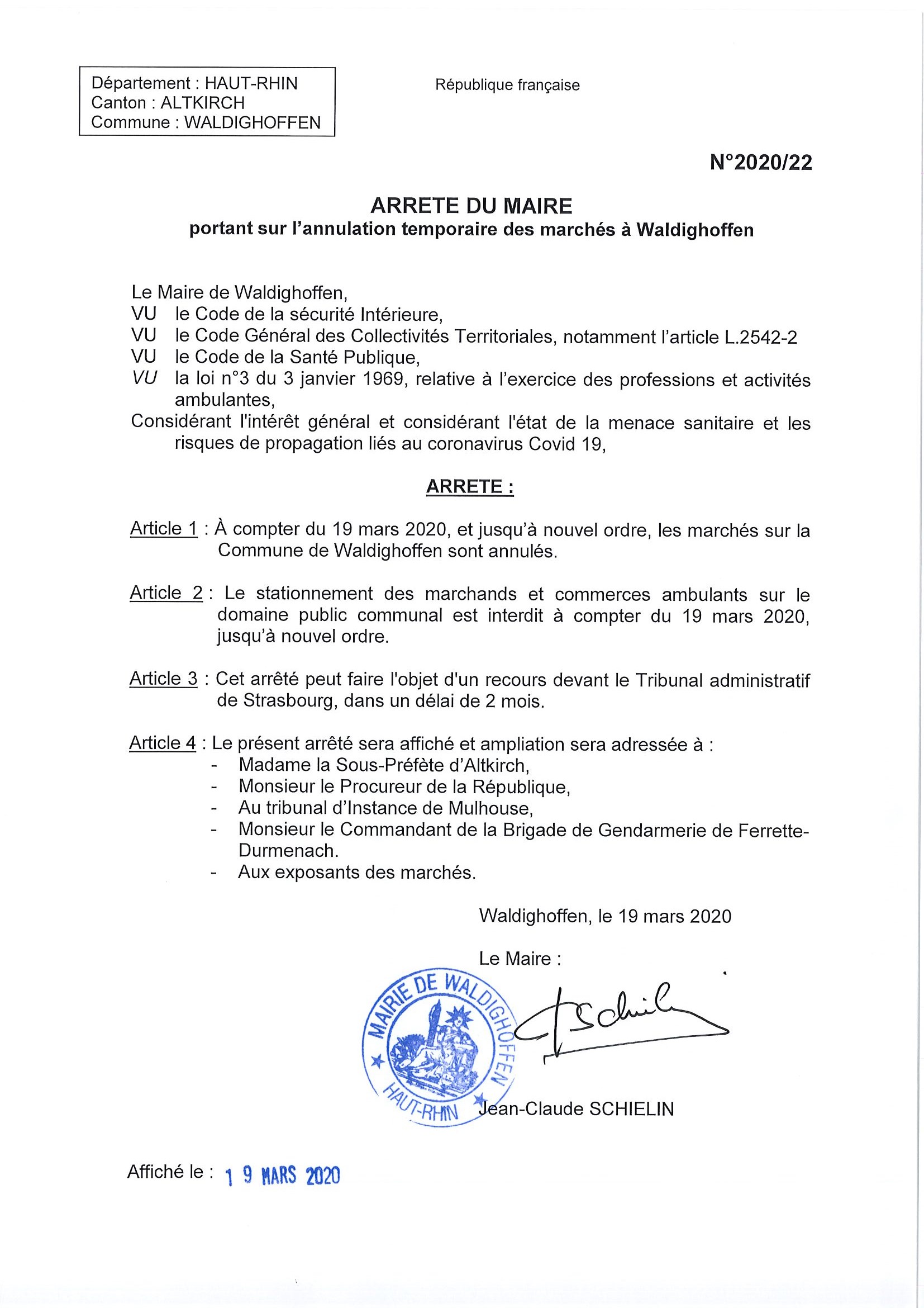 Arrêté du Maire interdisant la tenue des marchés sur la Commune de Waldighoffen