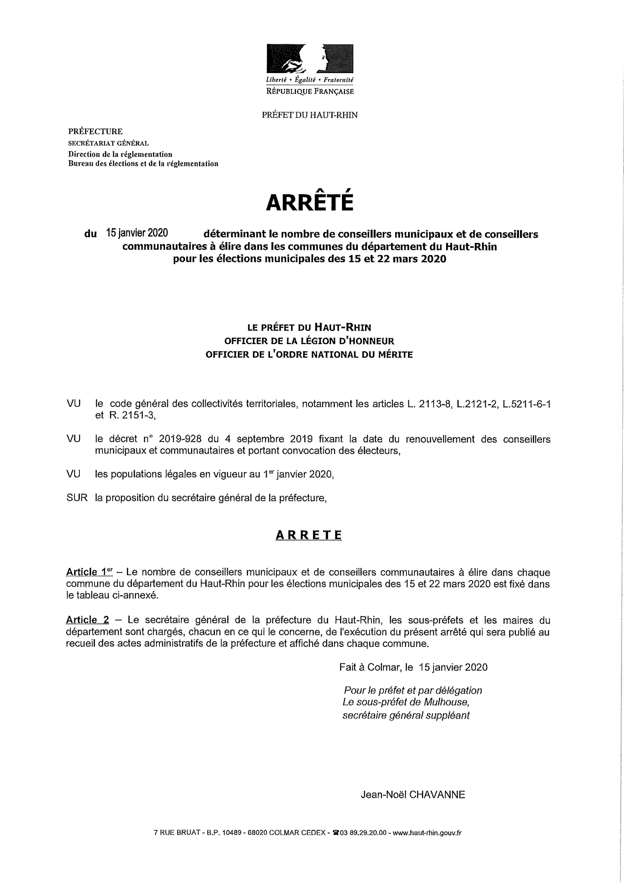 Arrêté préfectoral du 15 janvier 2020 fixant le nombre de conseillers municipaux et communautaires à élire dans le département du Haut-Rhin