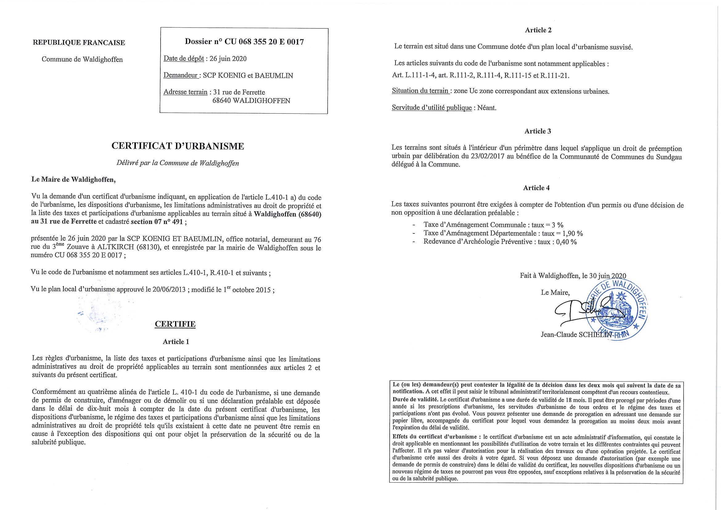 Certificat d'urbanisme établi pour la Scp Koenig et Baeumlin