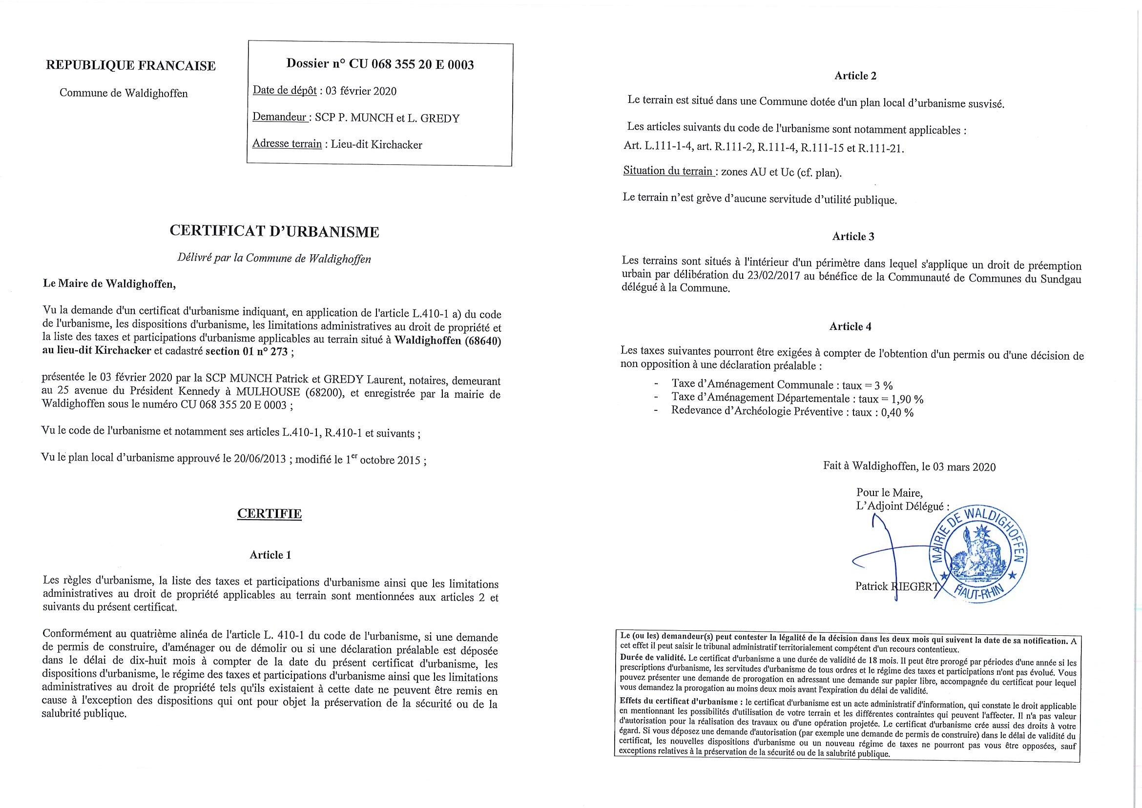 Certificat d'urbanisme établi pour la Scp Munch et Gredy, Office notarial