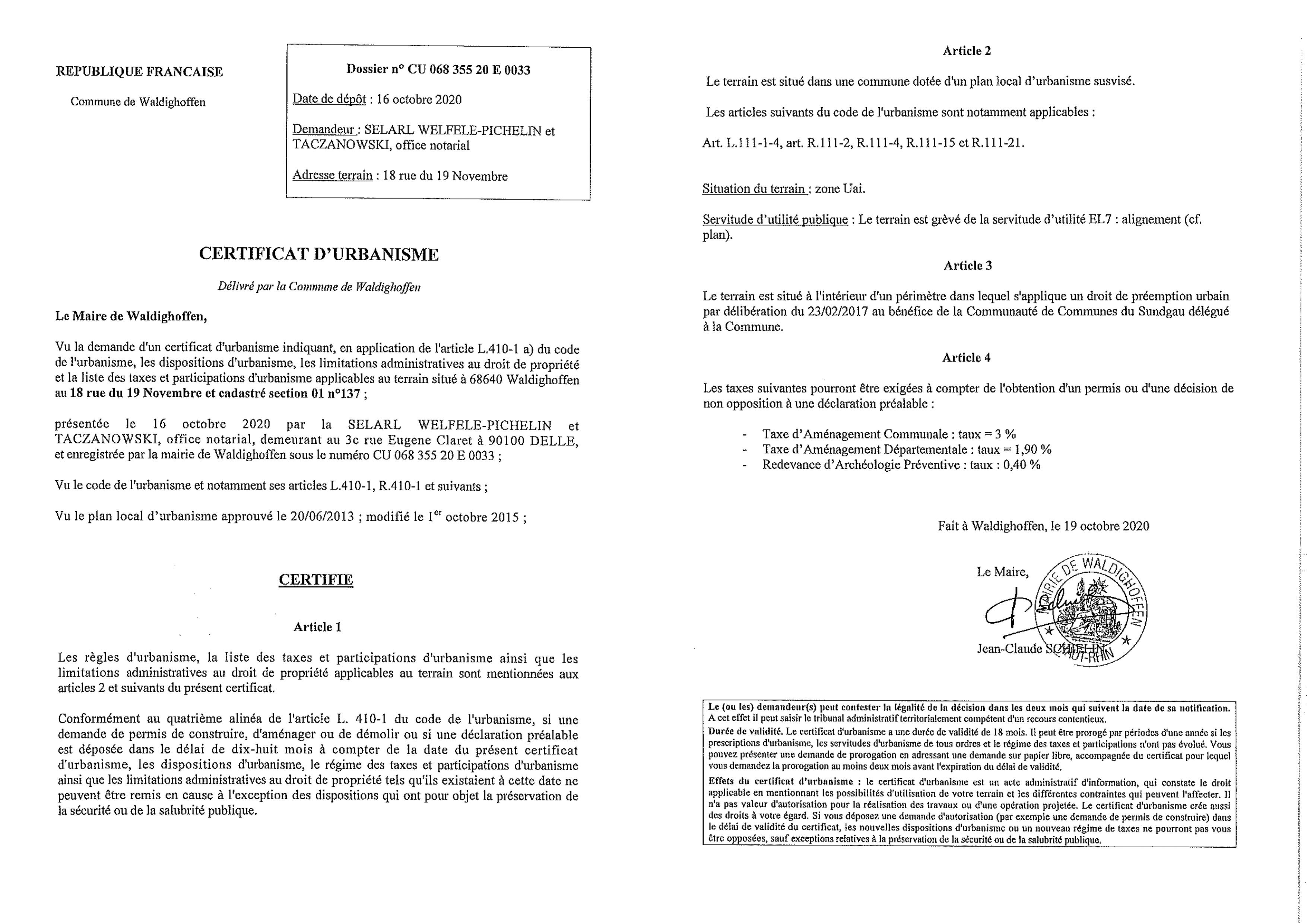 Certificat d'urbanisme établi pour la Selarl Welfele-Pichelin et Taczanowski, office notarial