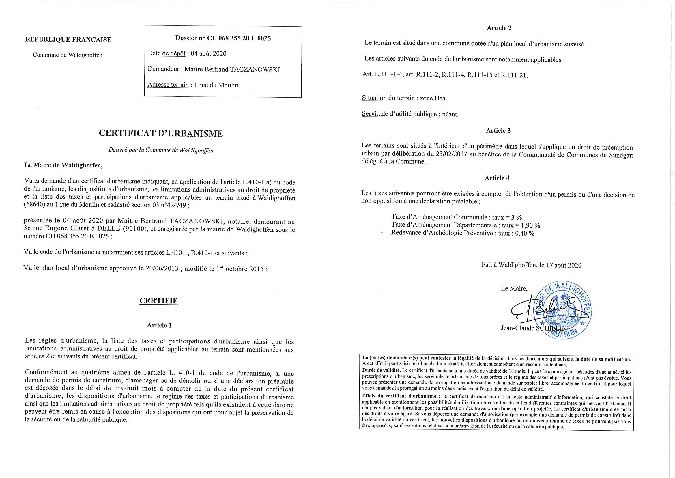 Certificat d'urbanisme établi pour Maître Bertrand Taczanowski, notaire