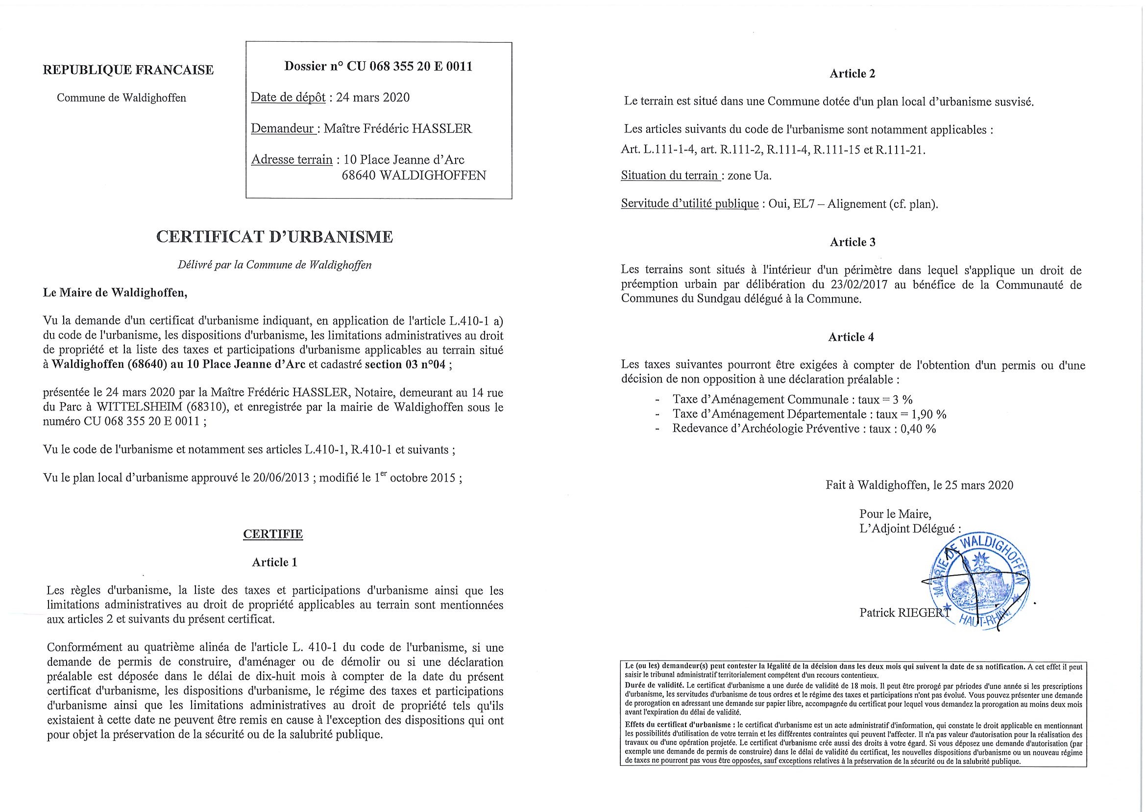 Vous êtes ici : Accueil Mairie Affichage public Annexes affichage public 2020 Certificat d'urbanisme établi pour Maître Hassler Frédéric