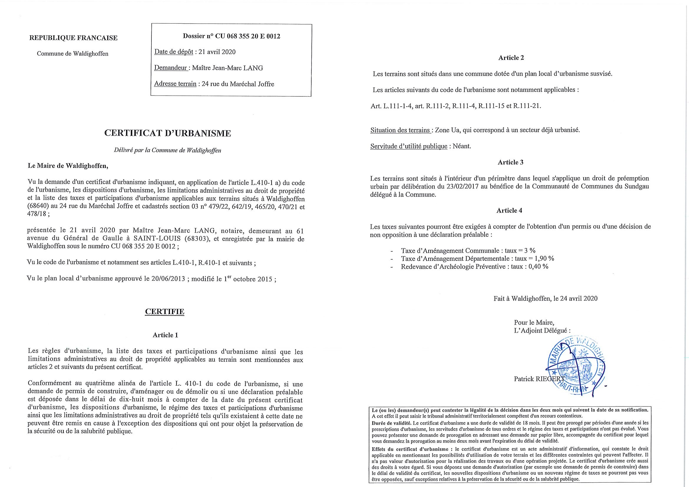 Un certificat d'urbanisme opérationnel établi Maître Jean-Marc LANG, concernant un terrain situé au 24 rue du Maréchal Joffre