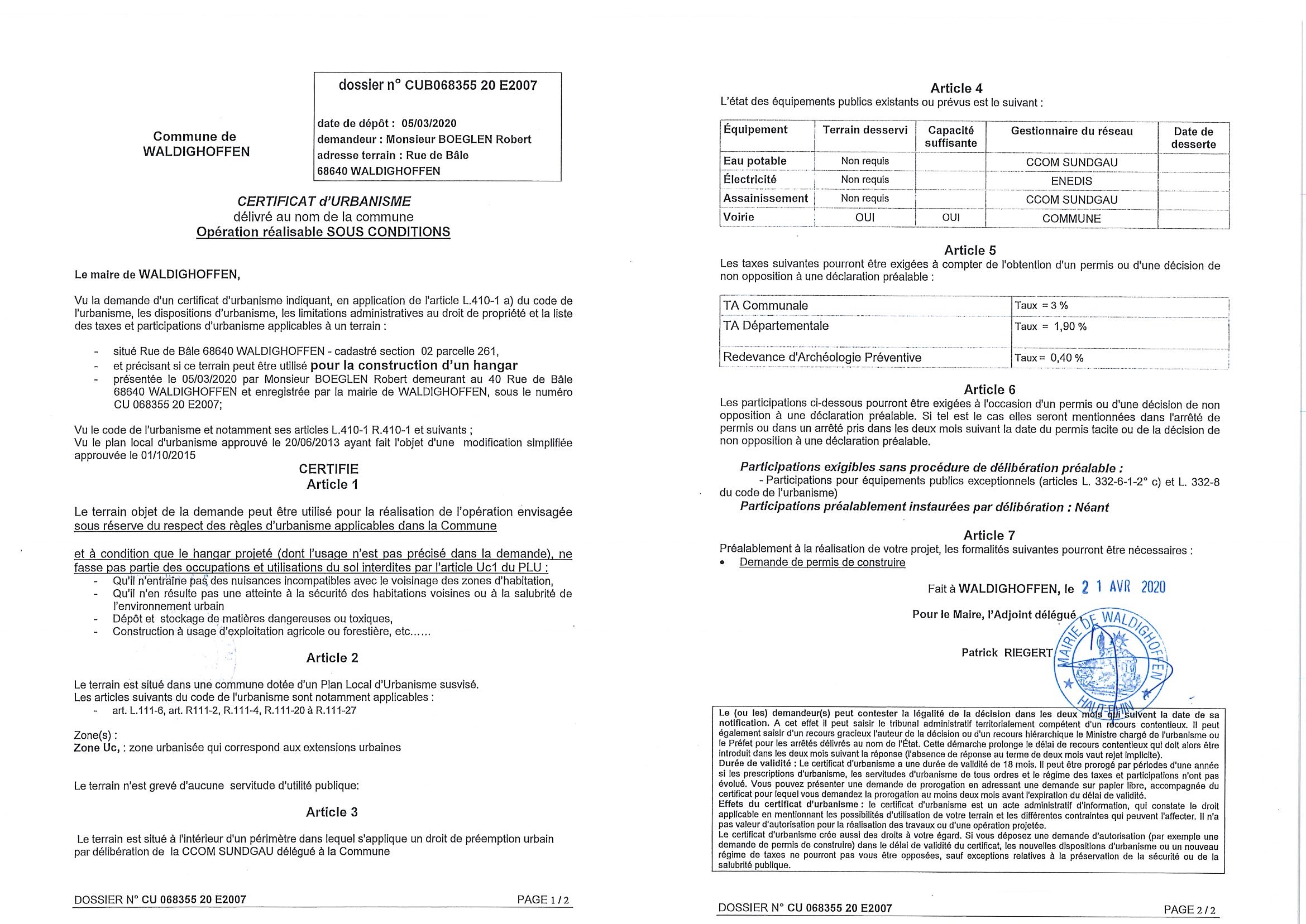 Vous êtes ici : Accueil Mairie Affichage public Annexes affichage public 2020 Certificat d'urbanisme établi pour Monsieur BOEGLEN Robert