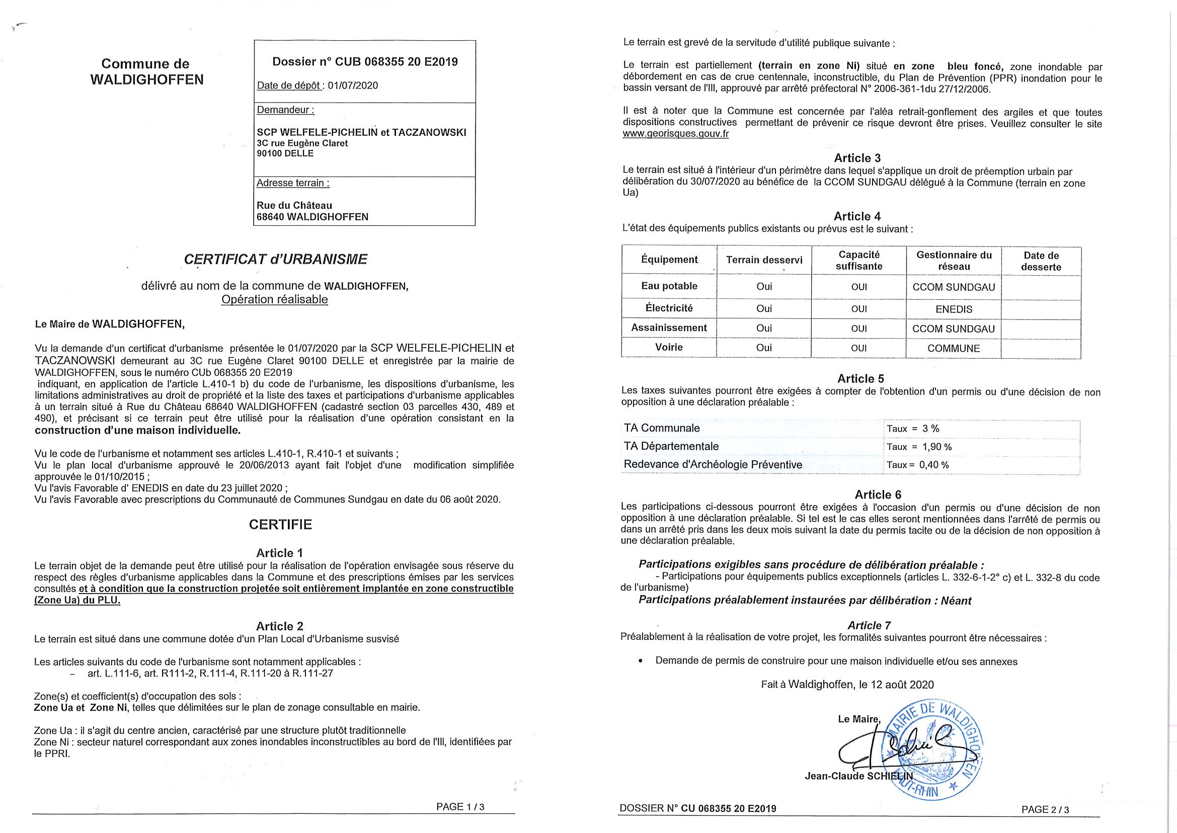 Certificat d'urbanisme opérationnel établi pour la Scp Welfele-Pichelin et Taczanowski, Office notarial
