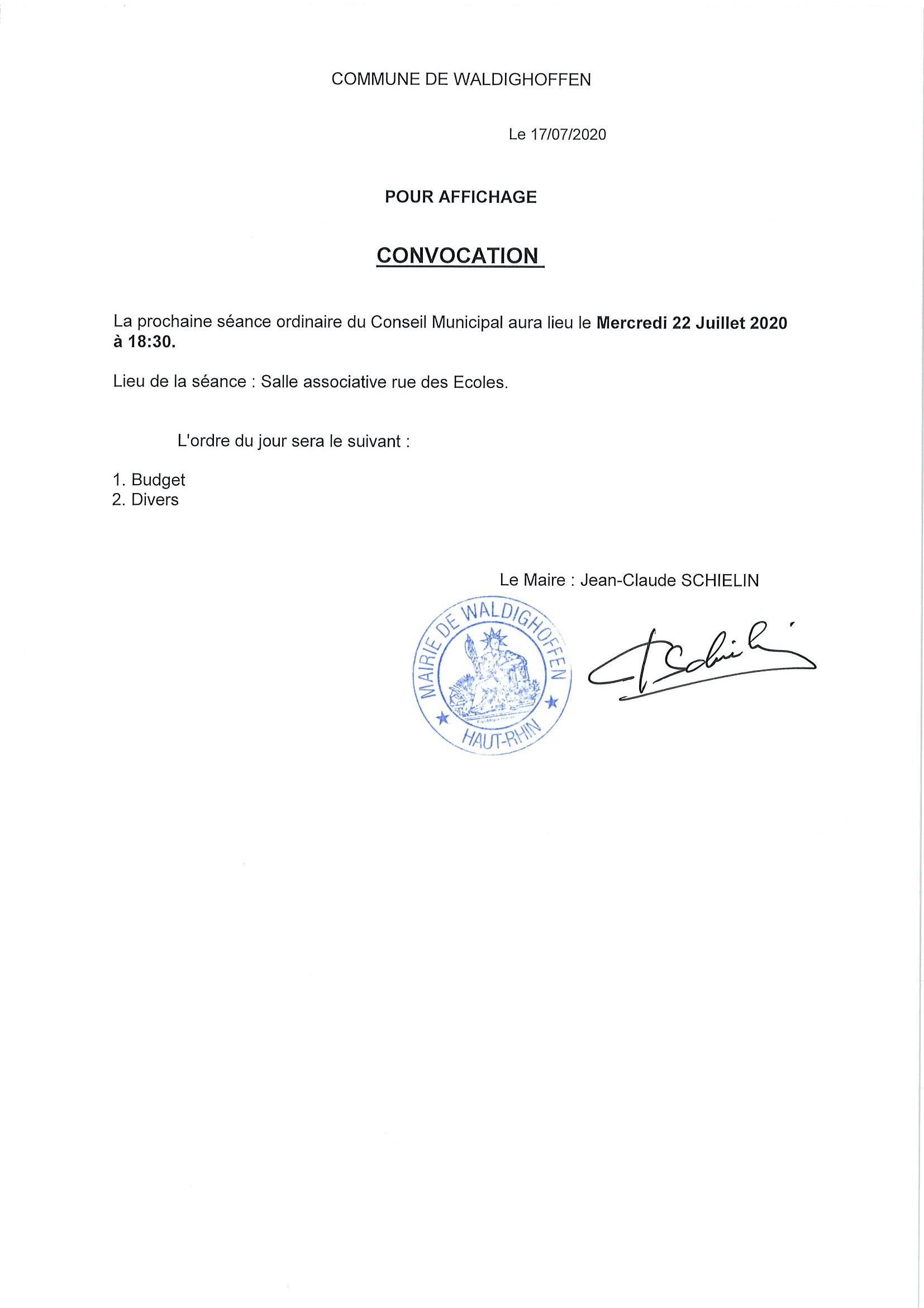 Le Conseil Municipal de Waldighoffen est convoqué en séance ordinaire le mercredi 22 juillet 2020.