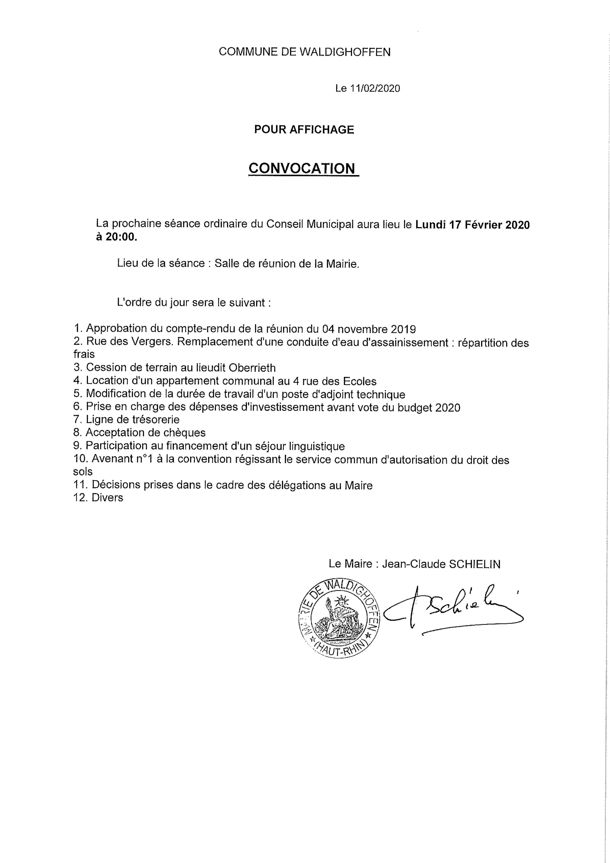 Convocation du Conseil Municipal le lundi 17 février 2020