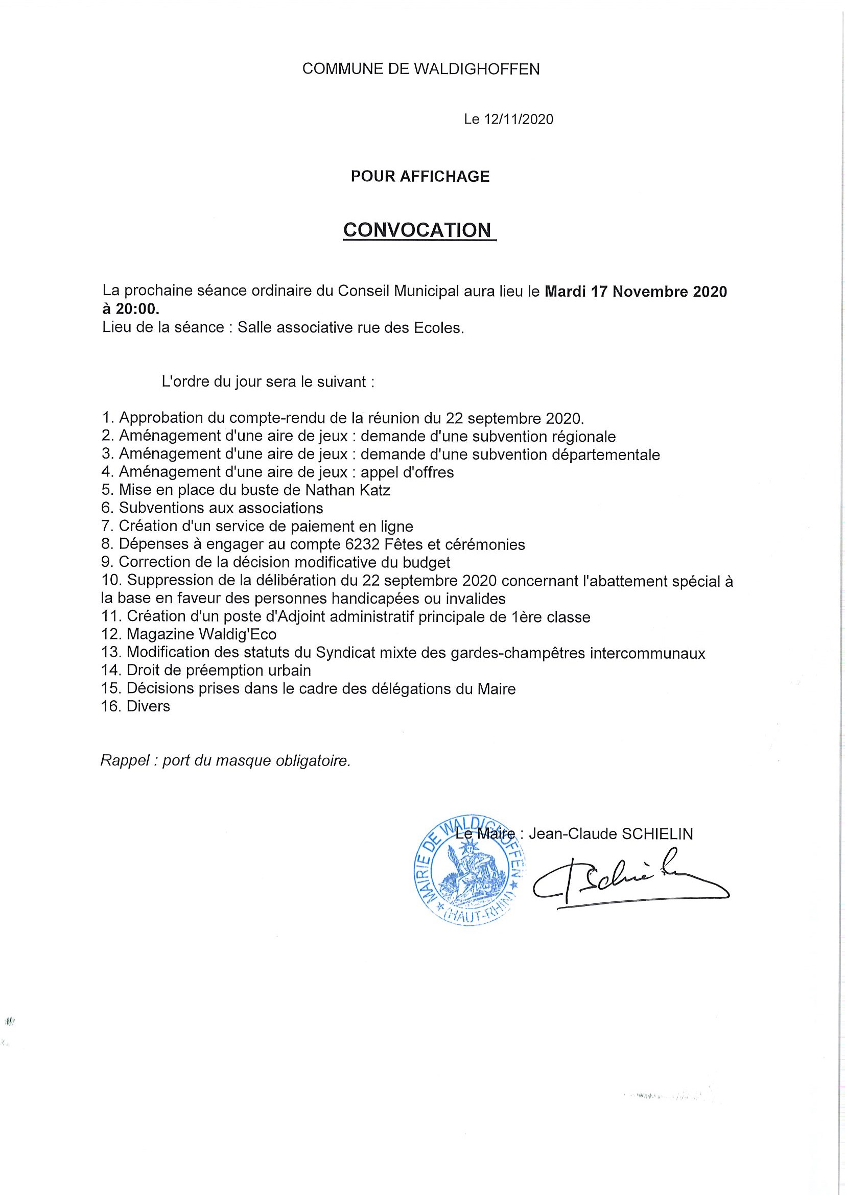 Vous êtes ici : Accueil Mairie Affichage public Annexes affichage public 2020 Convocation du Conseil Municipal le mardi 17 novembre 2020