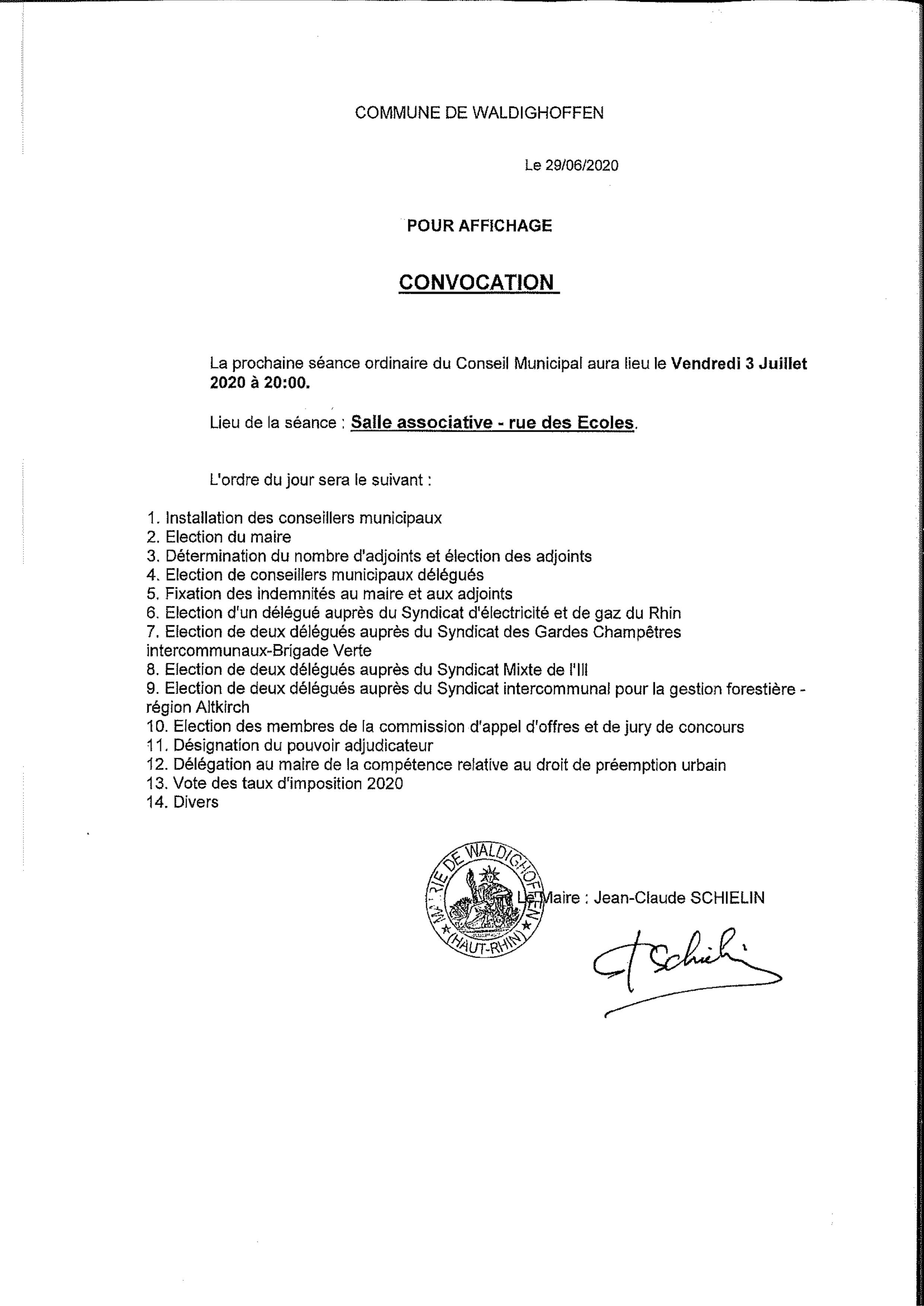 Convocation du Conseil Municipal le vendredi 03 juillet 2020