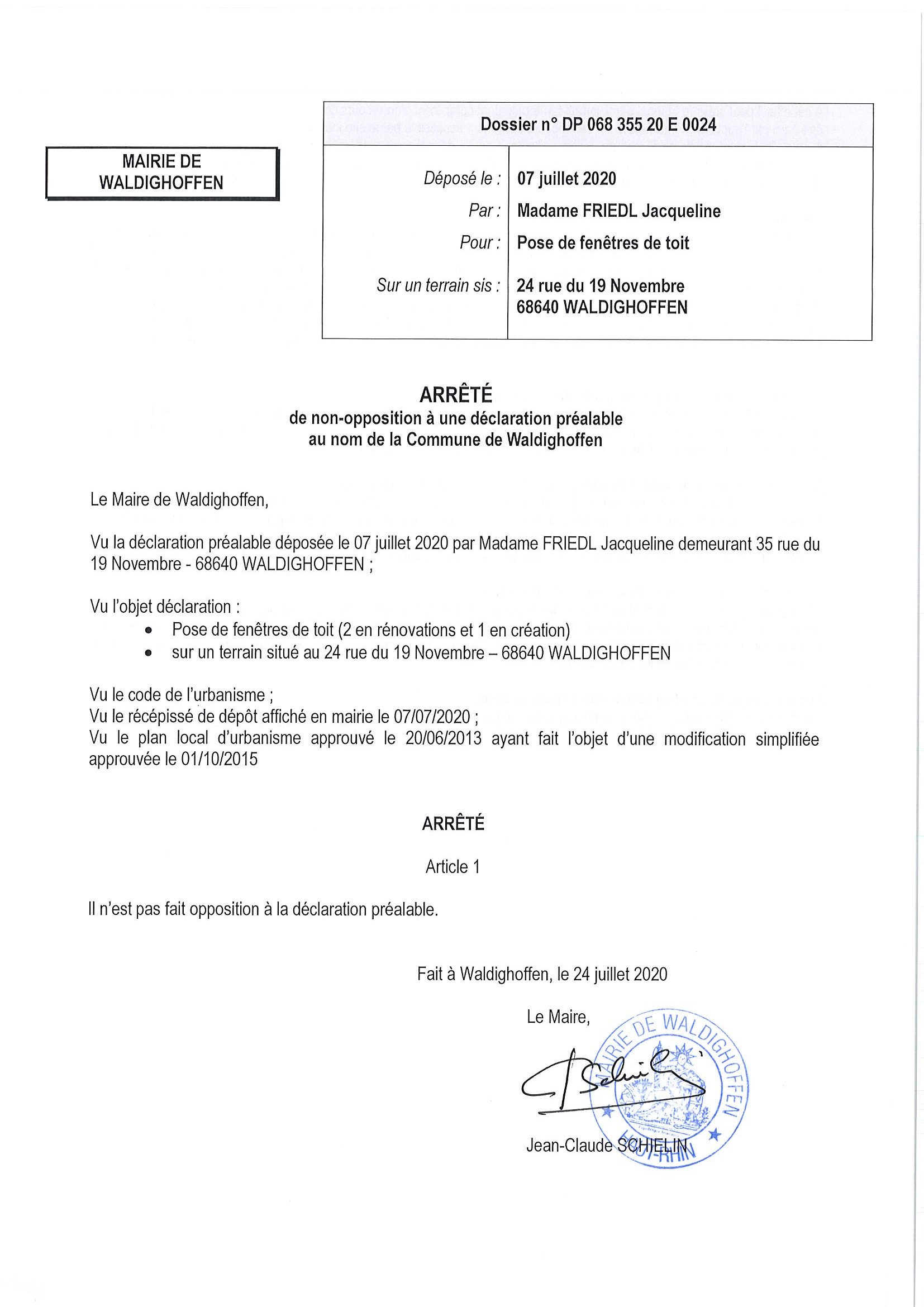 Certificat de non opposition délivré à Madame Friedl Jacqueline pour la pose de fenêtres de toit