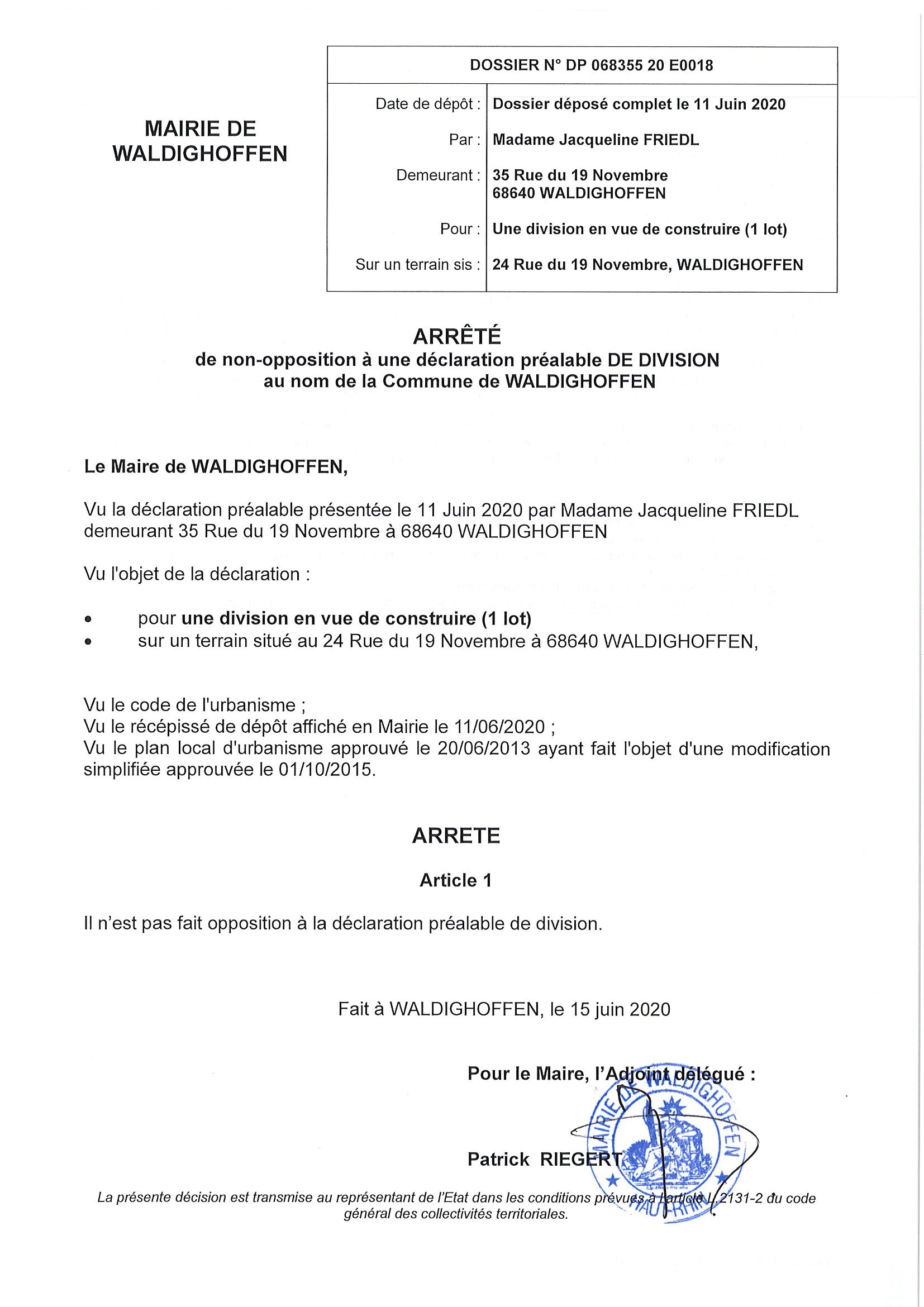 Certificat de non opposition délivré à Madame Friedl Jacqueline pour une division en vue de construire