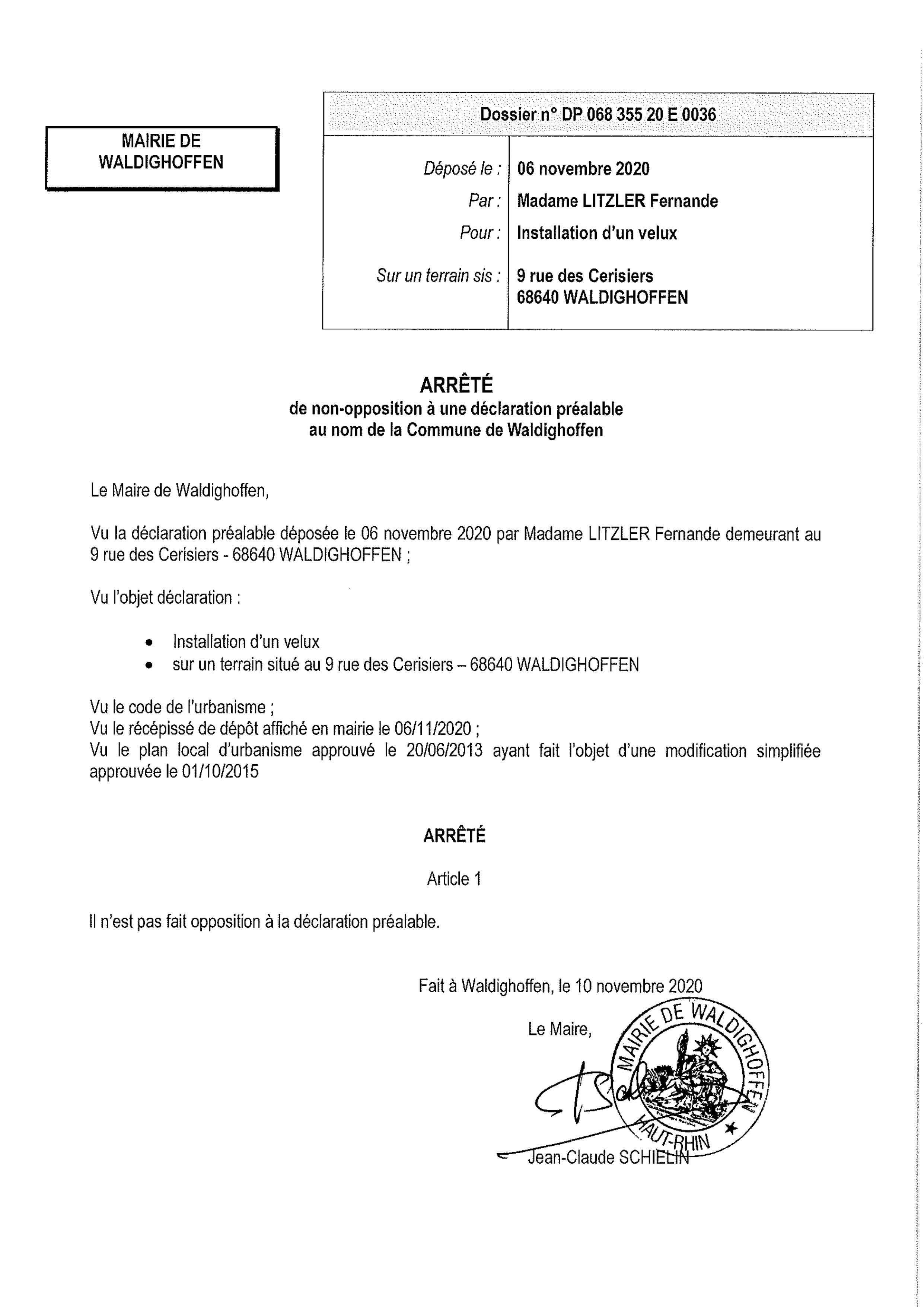 Certificat de non opposition délivré à Madame Litzler Fernande pour l'installation d'un velux