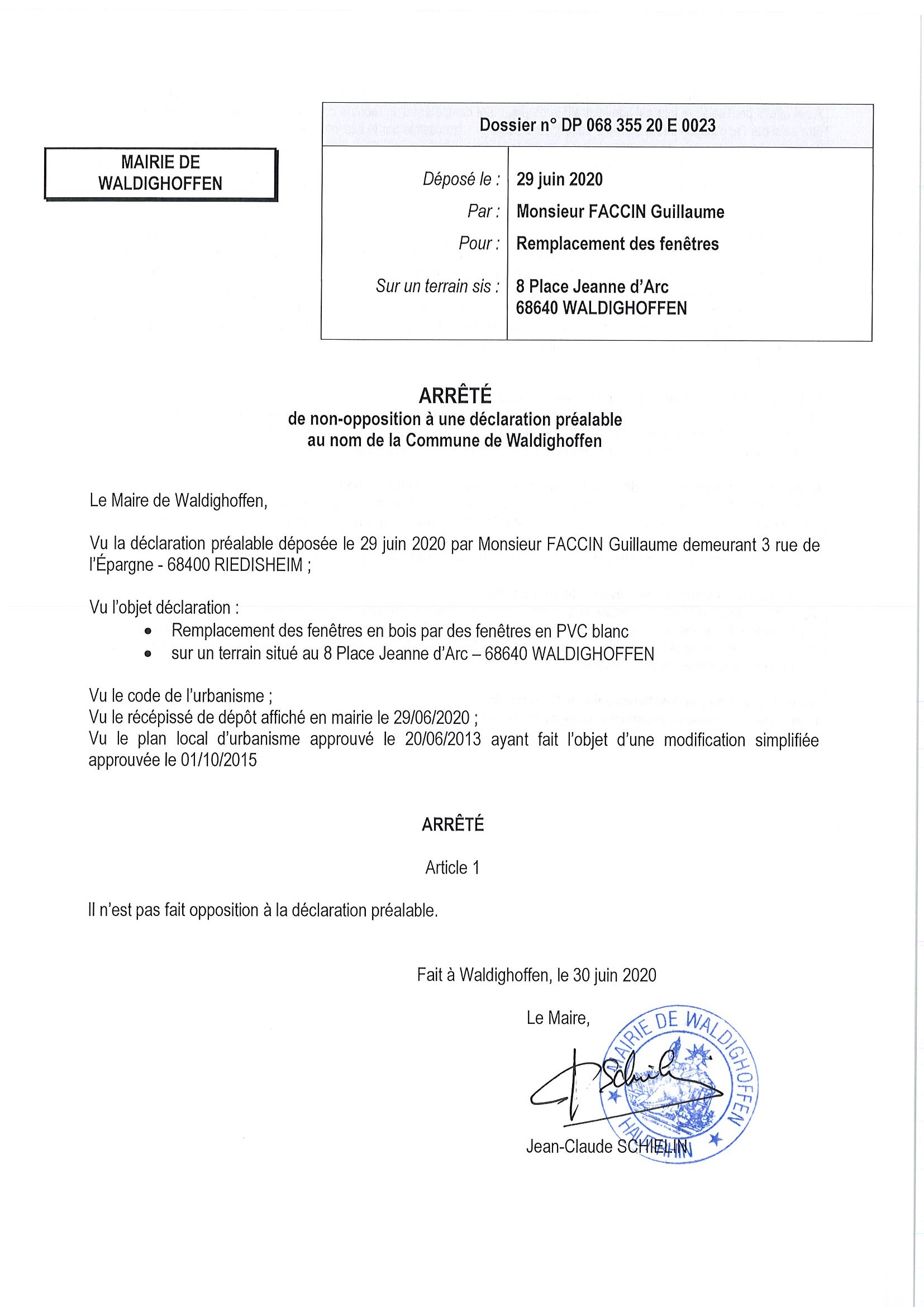 Certificat de non opposition délivré à Monsieur Faccin Guillaume pour le remplacement des fenêtres