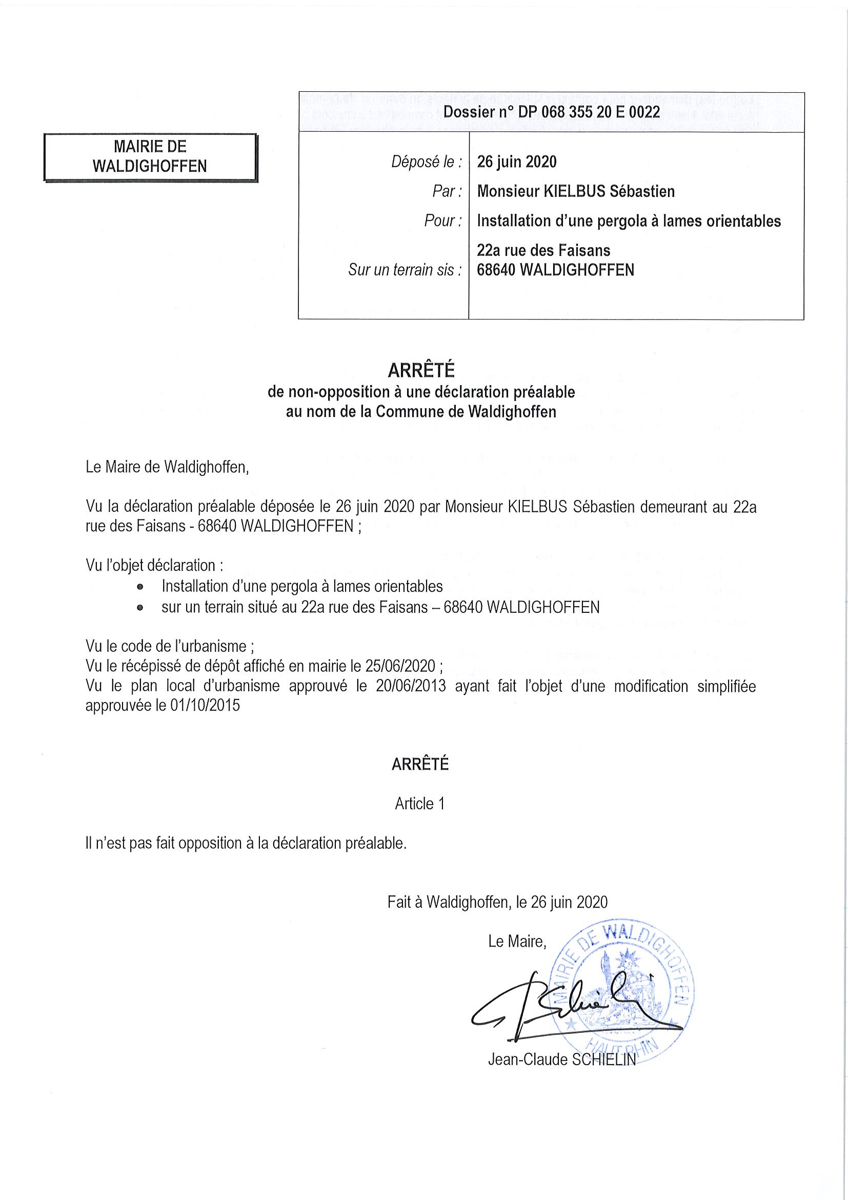 Certificat de non opposition délivré à Monsieur Kielbus Sébastien pour l'installation d'une pergola
