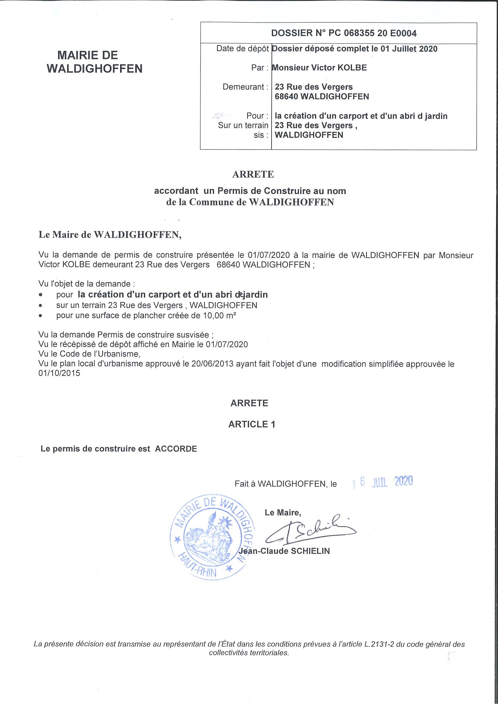 Vous êtes ici : Accueil Mairie Affichage public Annexes affichage public 2020 Décision à la demande d'autorisation à Monsieur Kolbe Victor