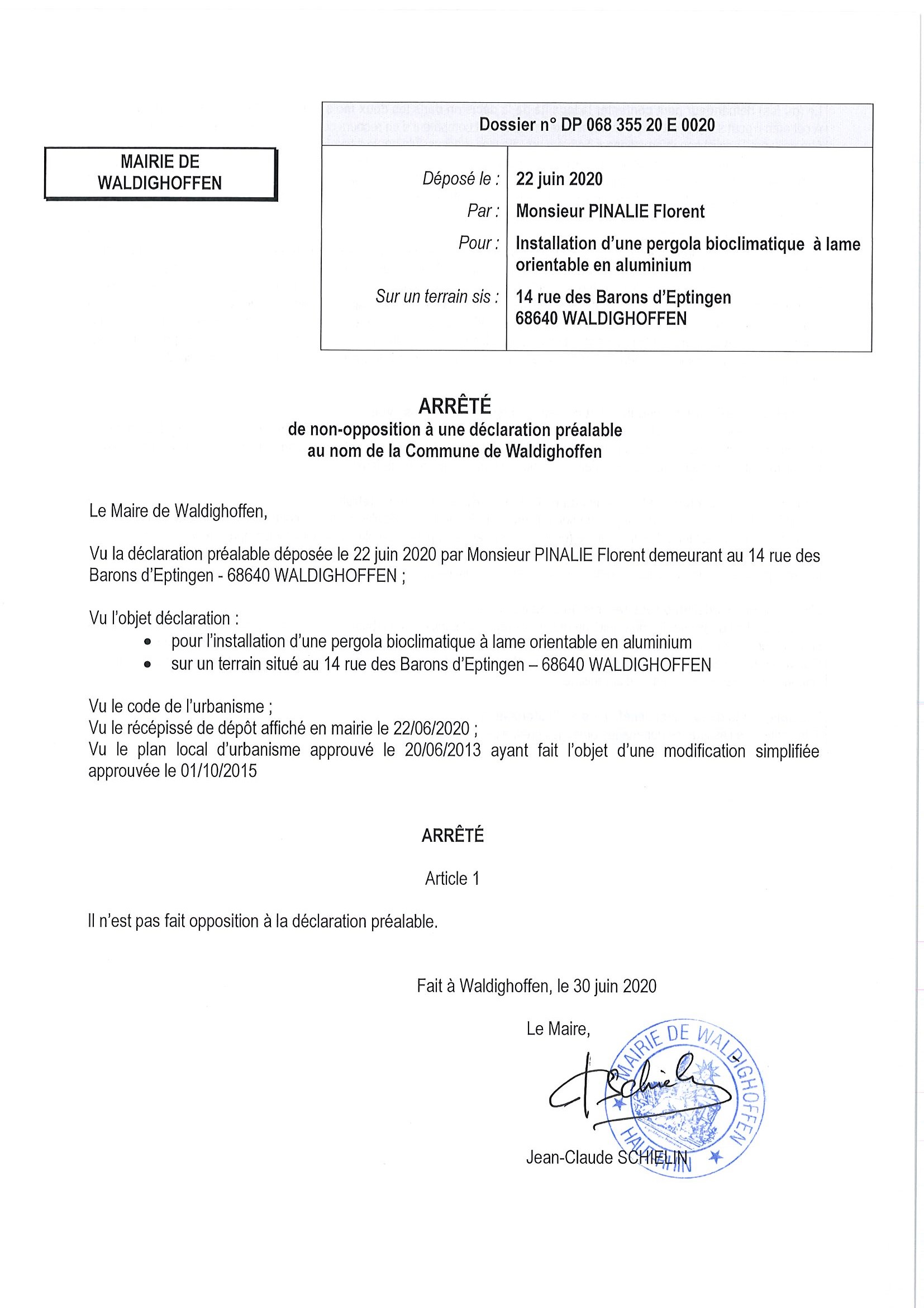 Certificat de non opposition délivré à Monsieur Pinalie Florent pour l'installation d'une pergola bioclimatique à lame orientable