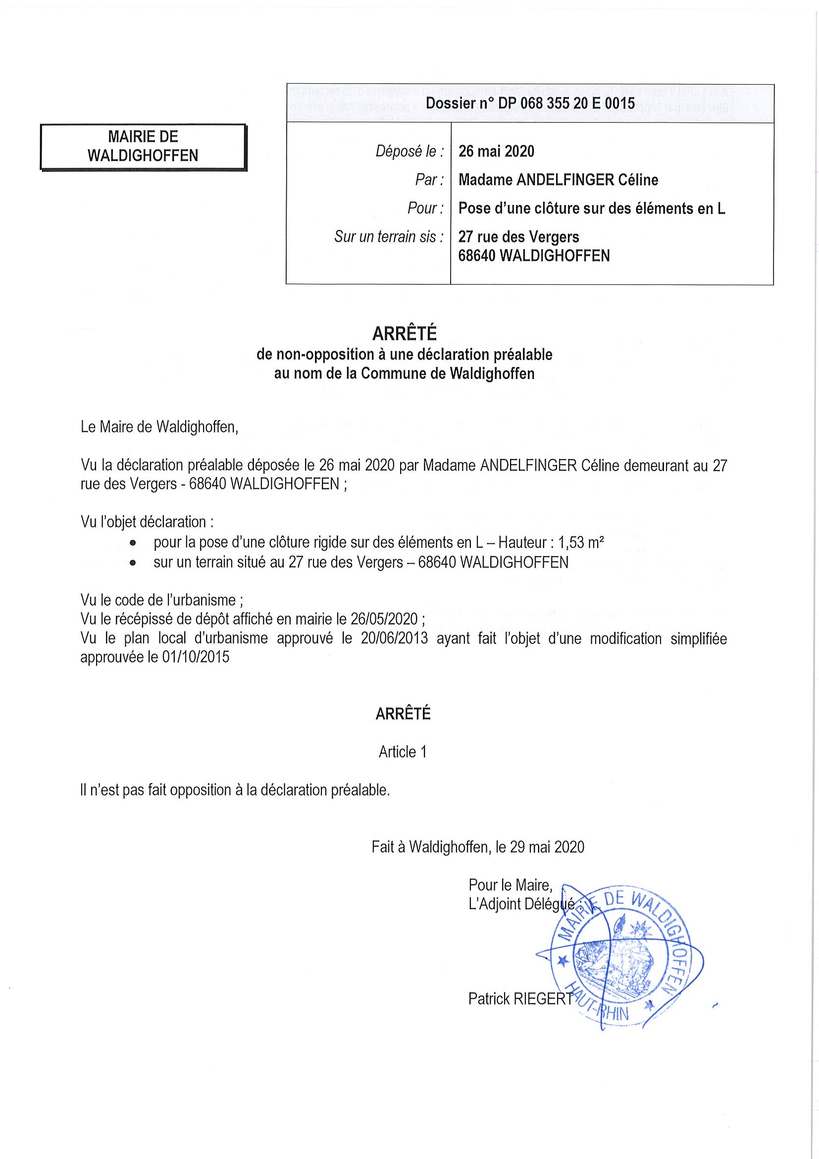 Certificat de non opposition délivré à Monsieur Madame Andelfinger Céline pour la pose d'une clôture sur des élements en L