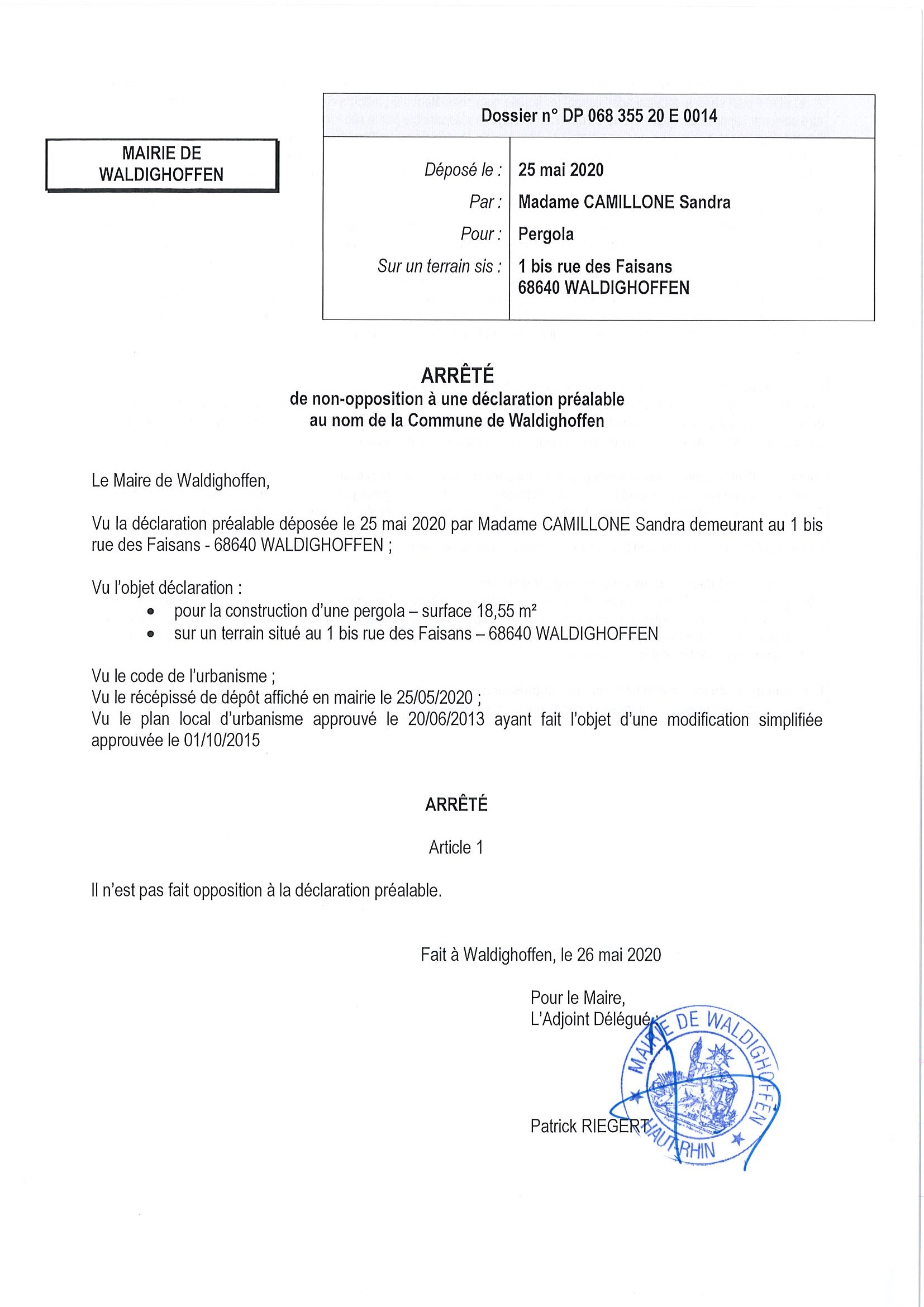 Certificat de non opposition délivré à Monsieur Madame Camillone Sandra pour la construction d'une pergola
