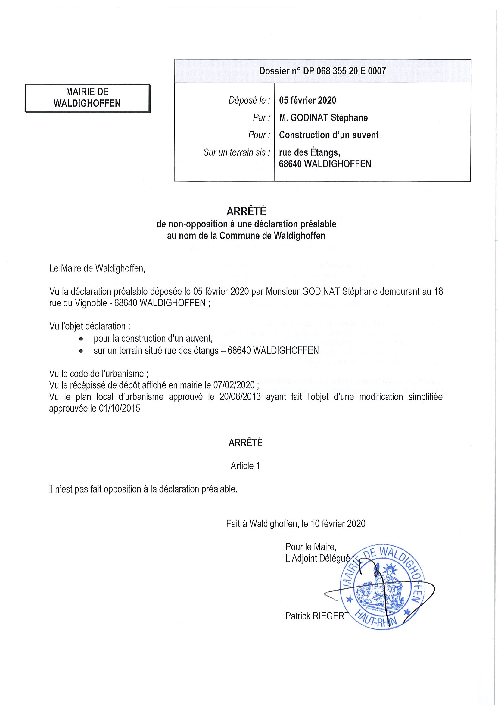 Vous êtes ici : Accueil Mairie Affichage public Annexes affichage public 2020 Décision à la demande d'autorisation de Monsieur Godinat Stéphane