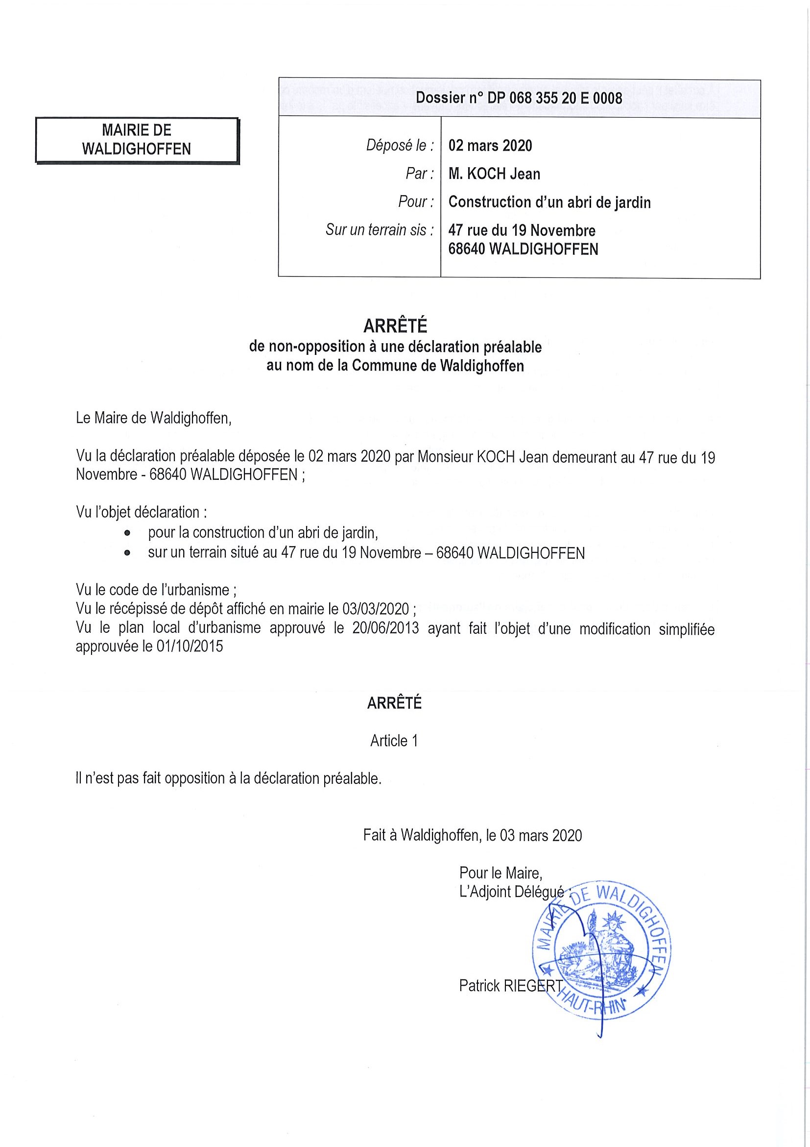 Certificat de non opposition délivré à Monsieur Koch Jean pour la construction d'un abri de jardin