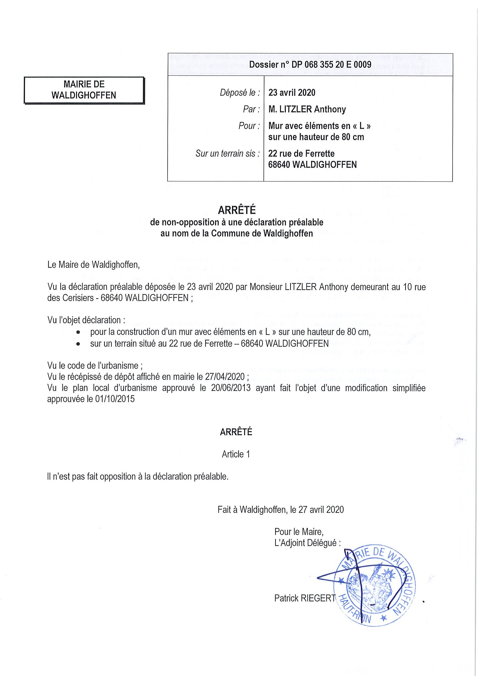 Certificat de non opposition délivré à Monsieur Litzler Anthony pour la construction d'un muret.