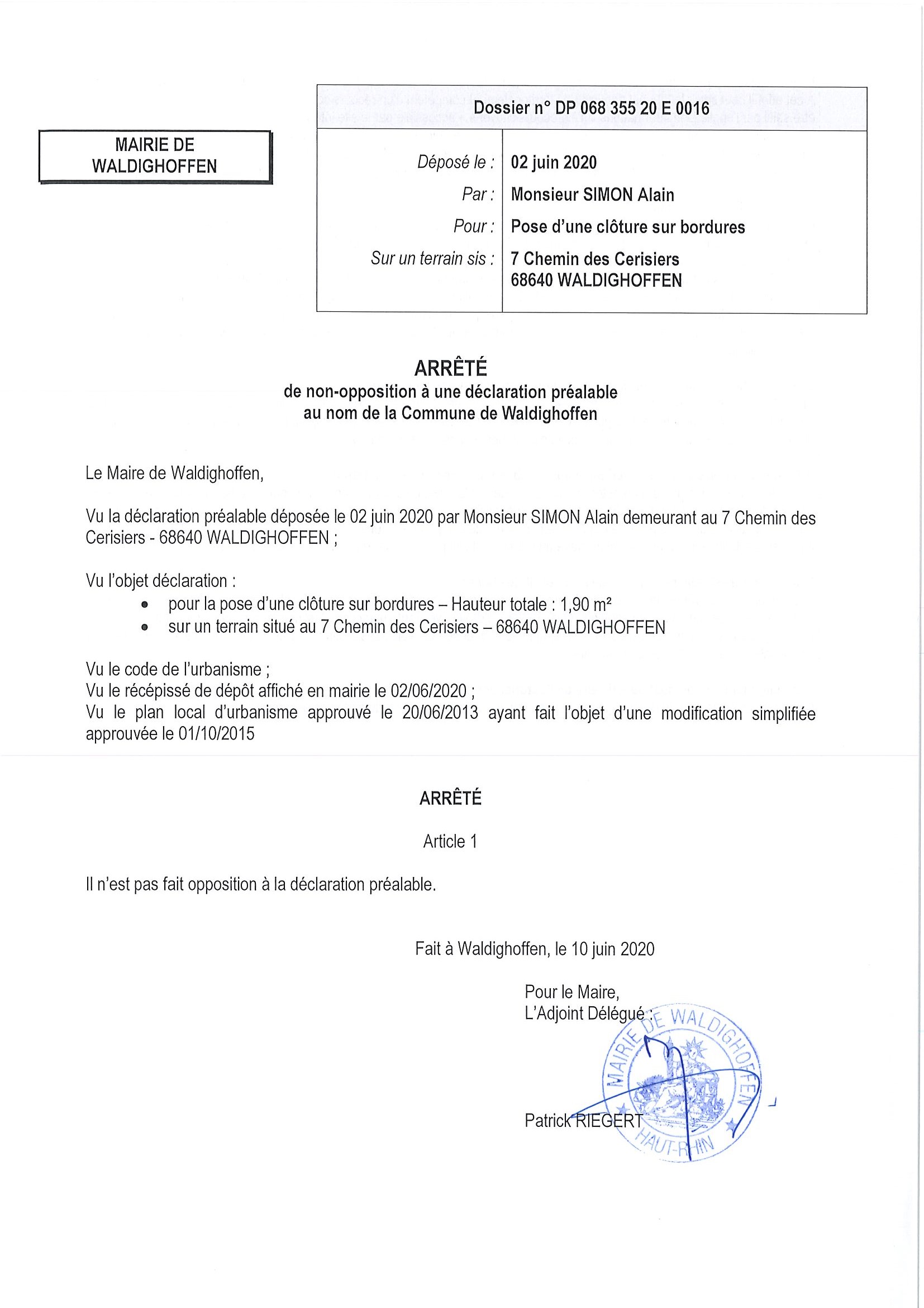 Vous êtes ici : Accueil Mairie Affichage public Annexes affichage public 2020 Décision à la demande d'autorisation de Monsieur Simon Alain