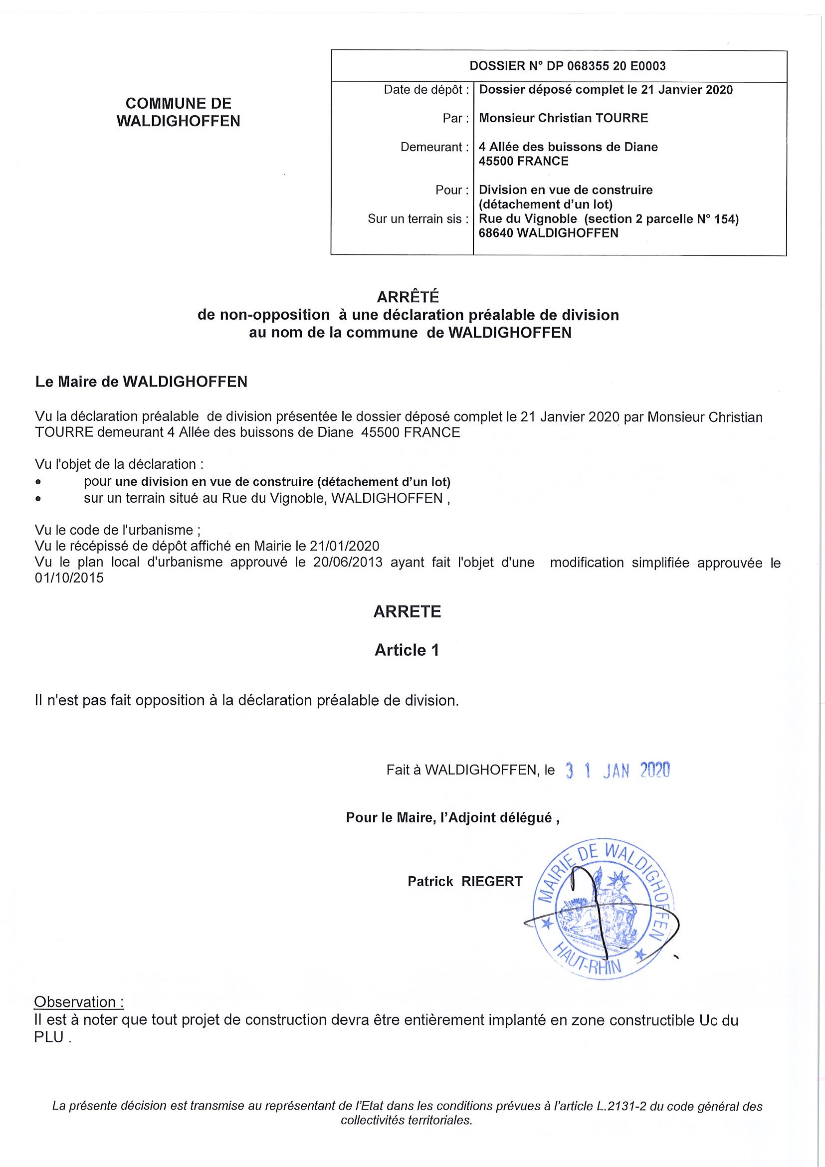 Certificat de non opposition délivré à Monsieur Tourre Christian pour une division foncière