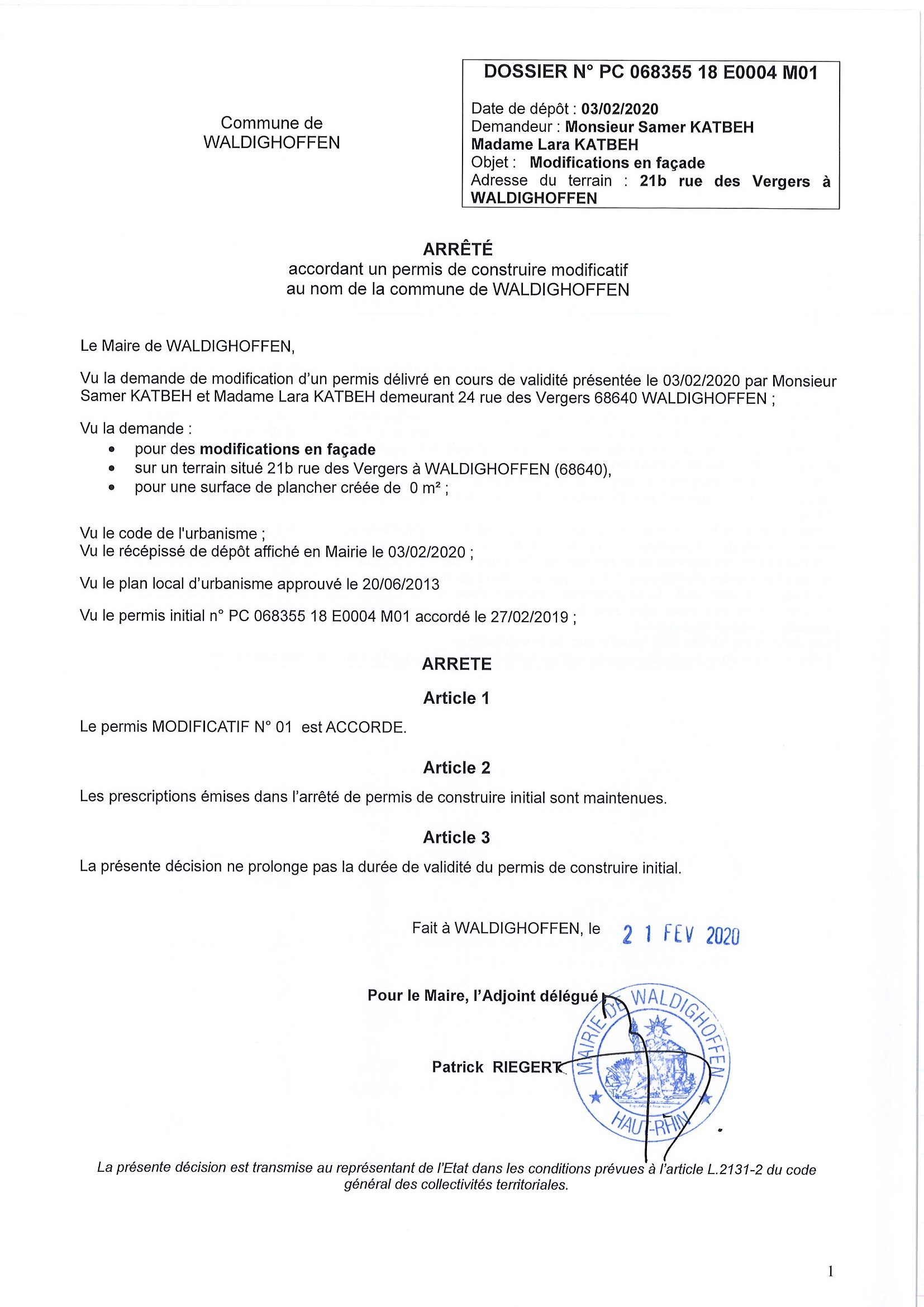 Décision à la demande de construire modificative de Monsieur et Madame Katbeh