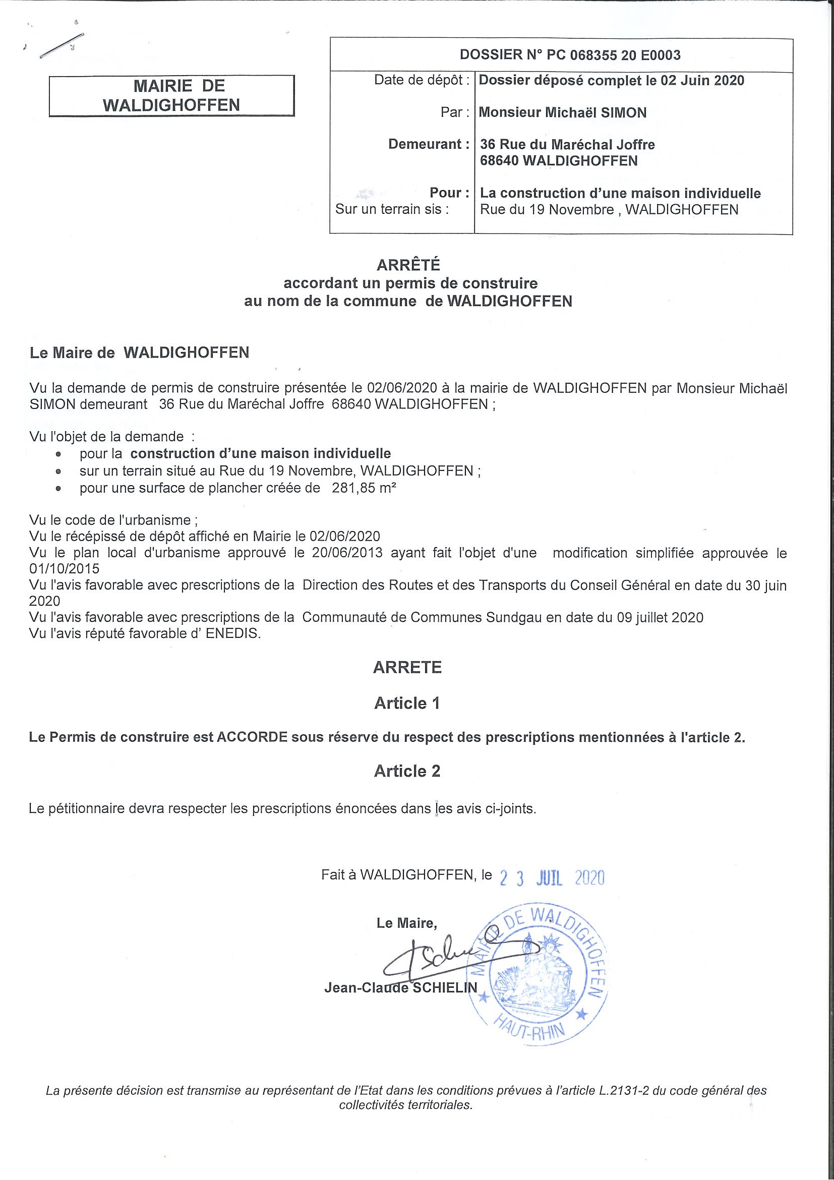 Vous êtes ici : Accueil Mairie Affichage public Annexes affichage public 2020 Décision à la demande de permis de construire de M. Simon Michaël
