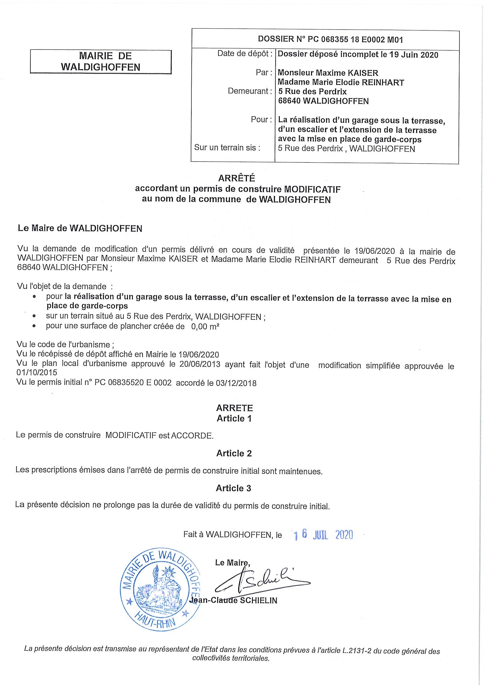 Décision à la demande de permis de construire modificative de M. Kaiser et Mme Reinhart