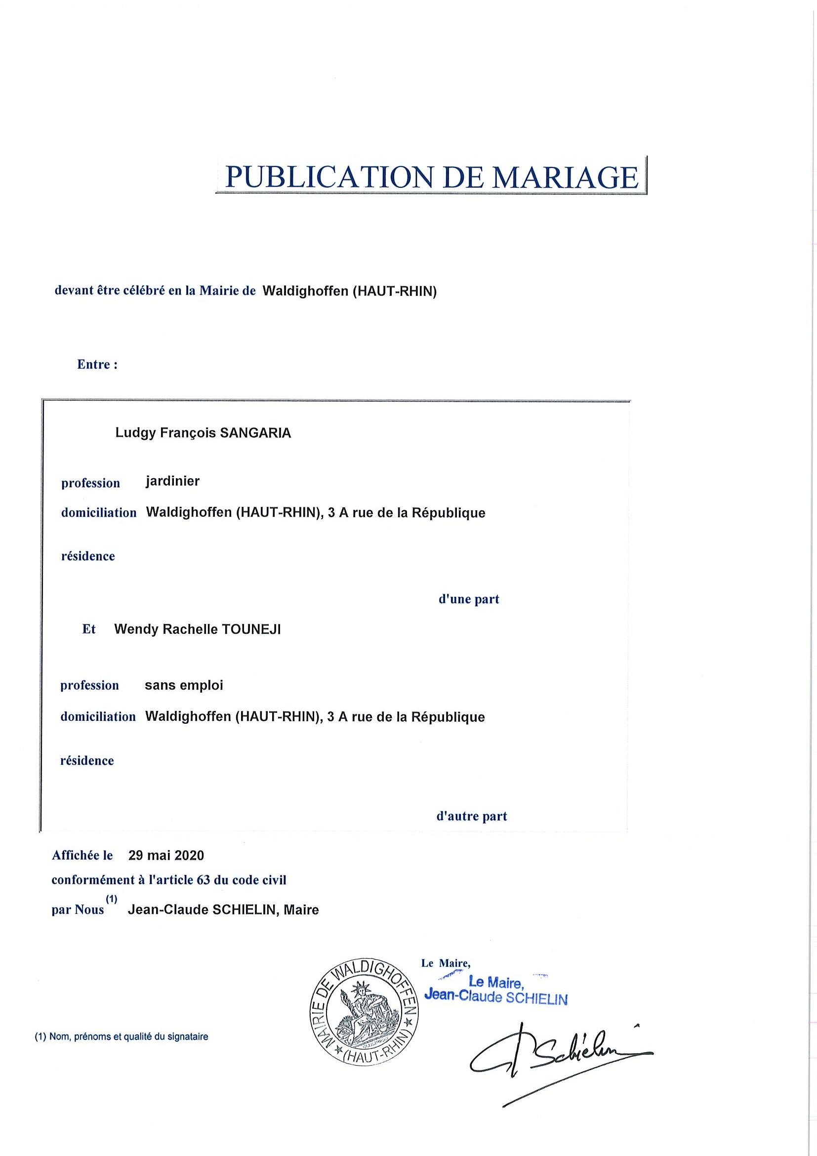 Publication de mariage entre M. SANGARIA Ludgy et Mme TOUNEJI Wendy