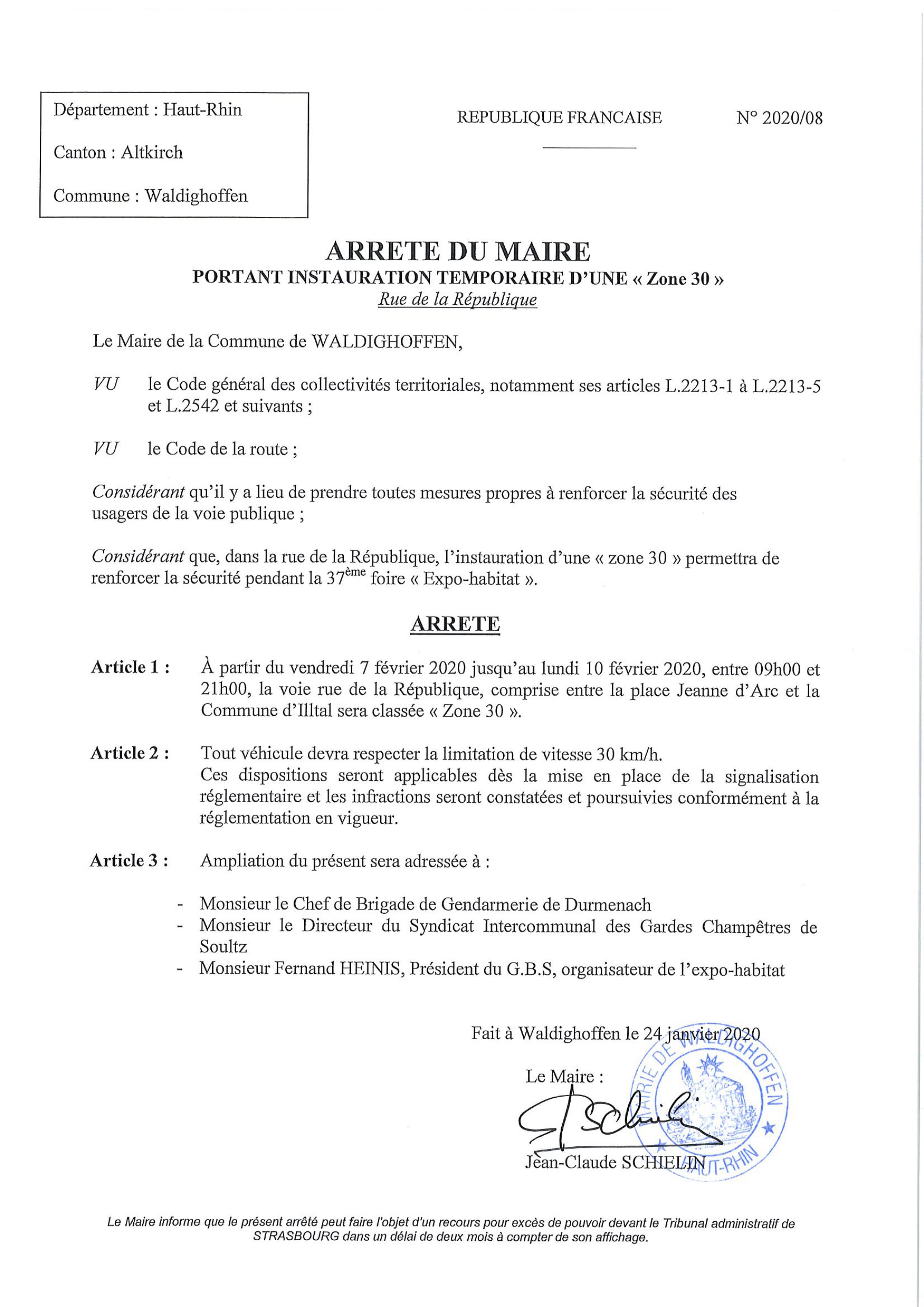 Arrêté du Maire instaurant une "zone 30" dans la rue de la République à l'occasion de l'expo-habitat