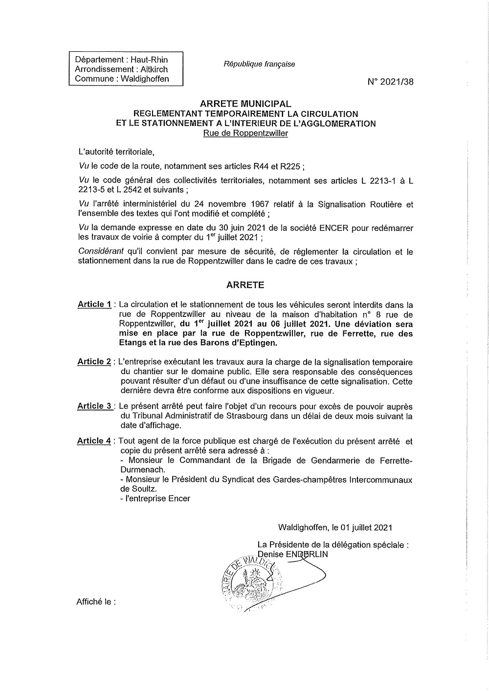 Vous êtes ici : Accueil Mairie Affichage public Annexes affichage public 2021 Arrêté de circulation 2021 38