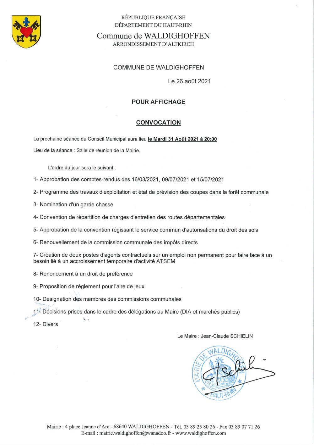 Vous êtes ici : Accueil Mairie Affichage public Annexes affichage public 2021 Convocation CM 31 aout 2021