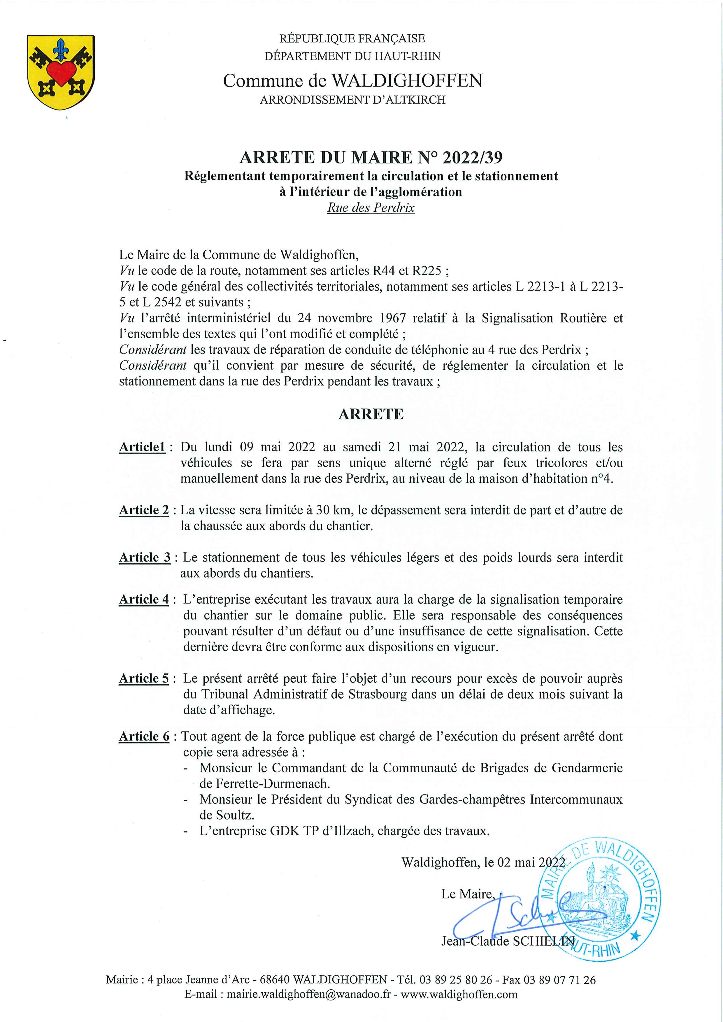 Vous êtes ici : Accueil Mairie Affichage public Annexes affichage public 2022 Arrêté municipal - rue des Perdix