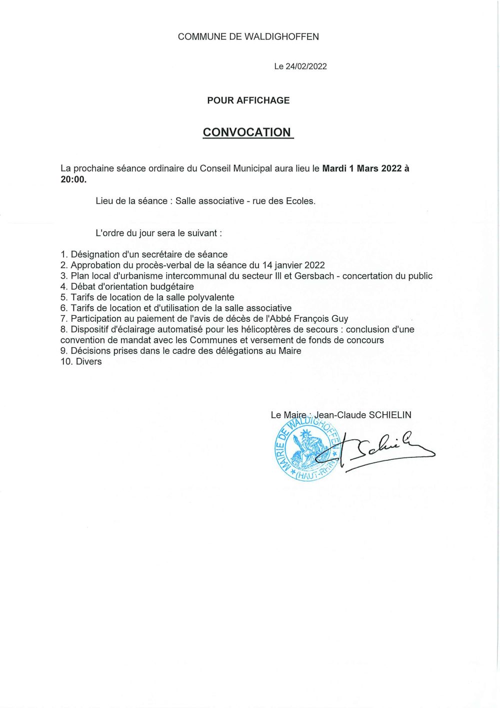 Convocation du CM de Waldighoffen le 1er mars 2022.