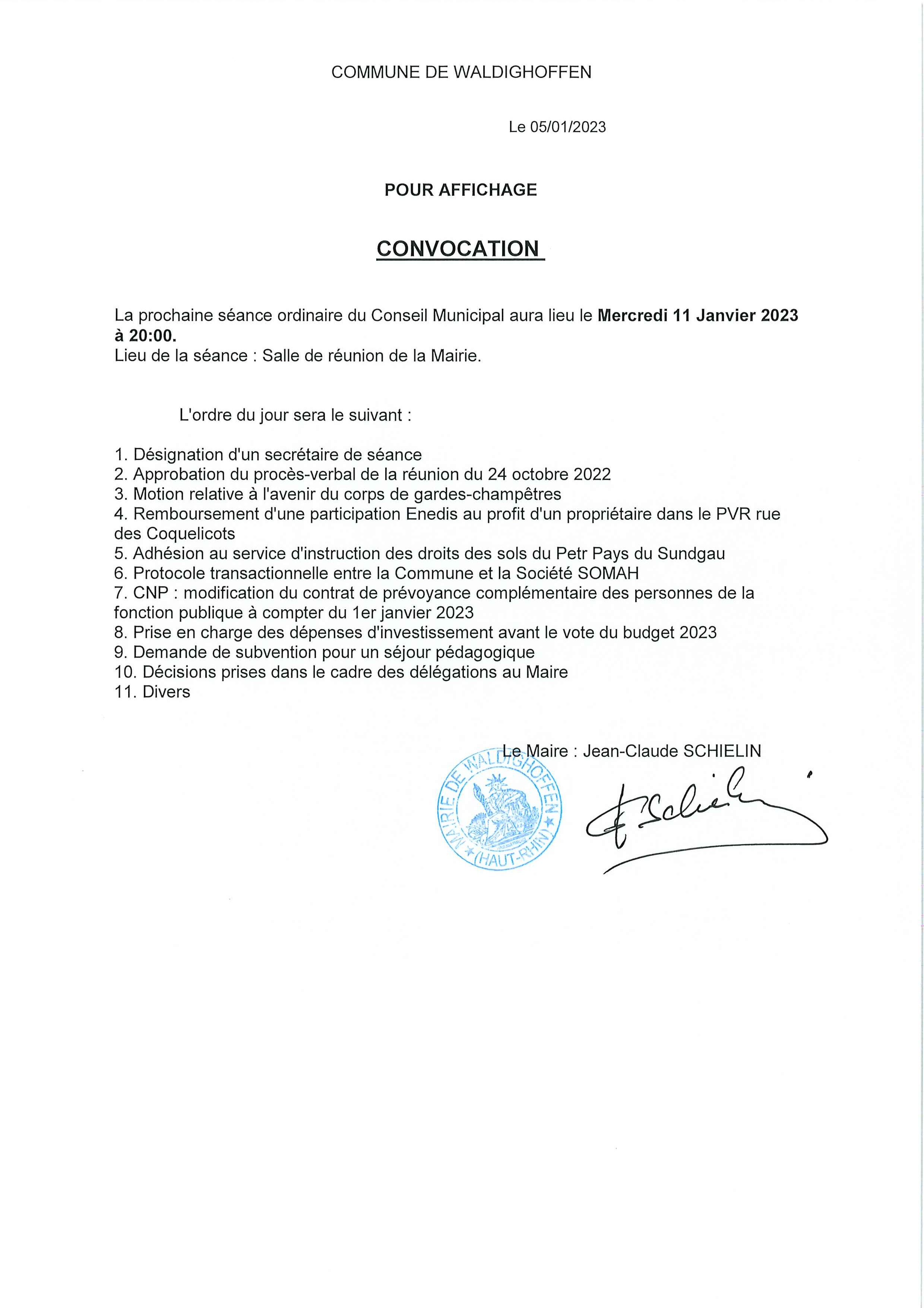 Vous êtes ici : Accueil Mairie Affichage public Annexes affichage public 2022 Convocation à la réunion du Conseil Municipal du 11/01/2023