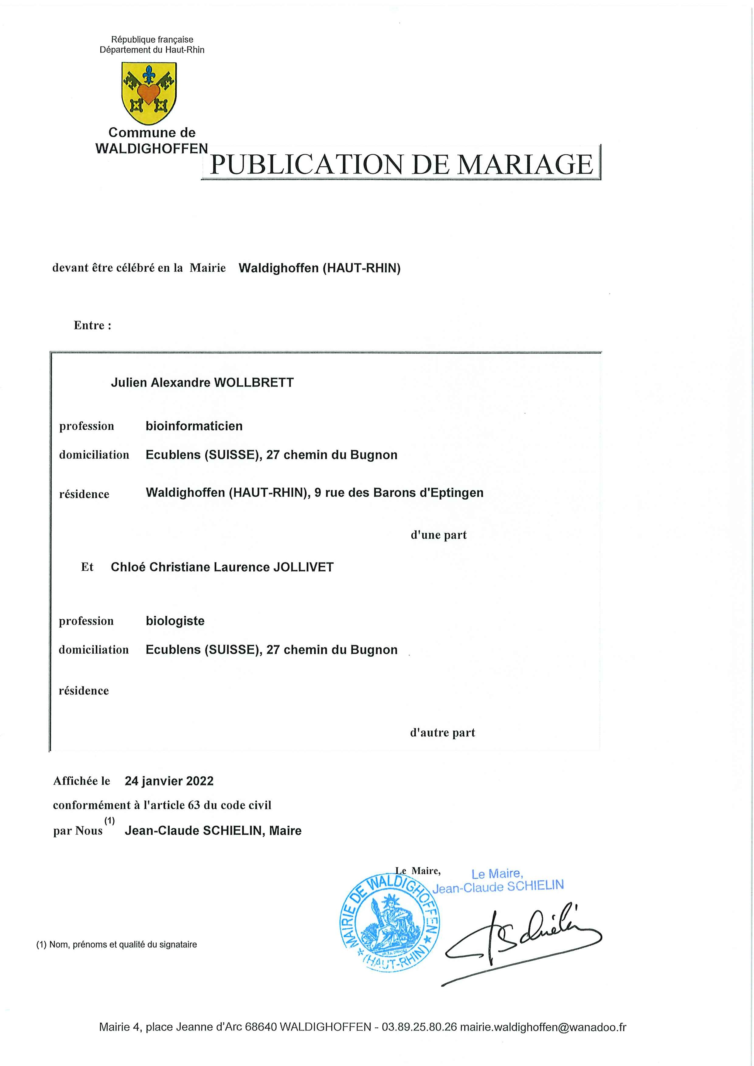 Publication de mariage entre M. Julien WOLLBRETT et Mme Chloé JOLLIVET