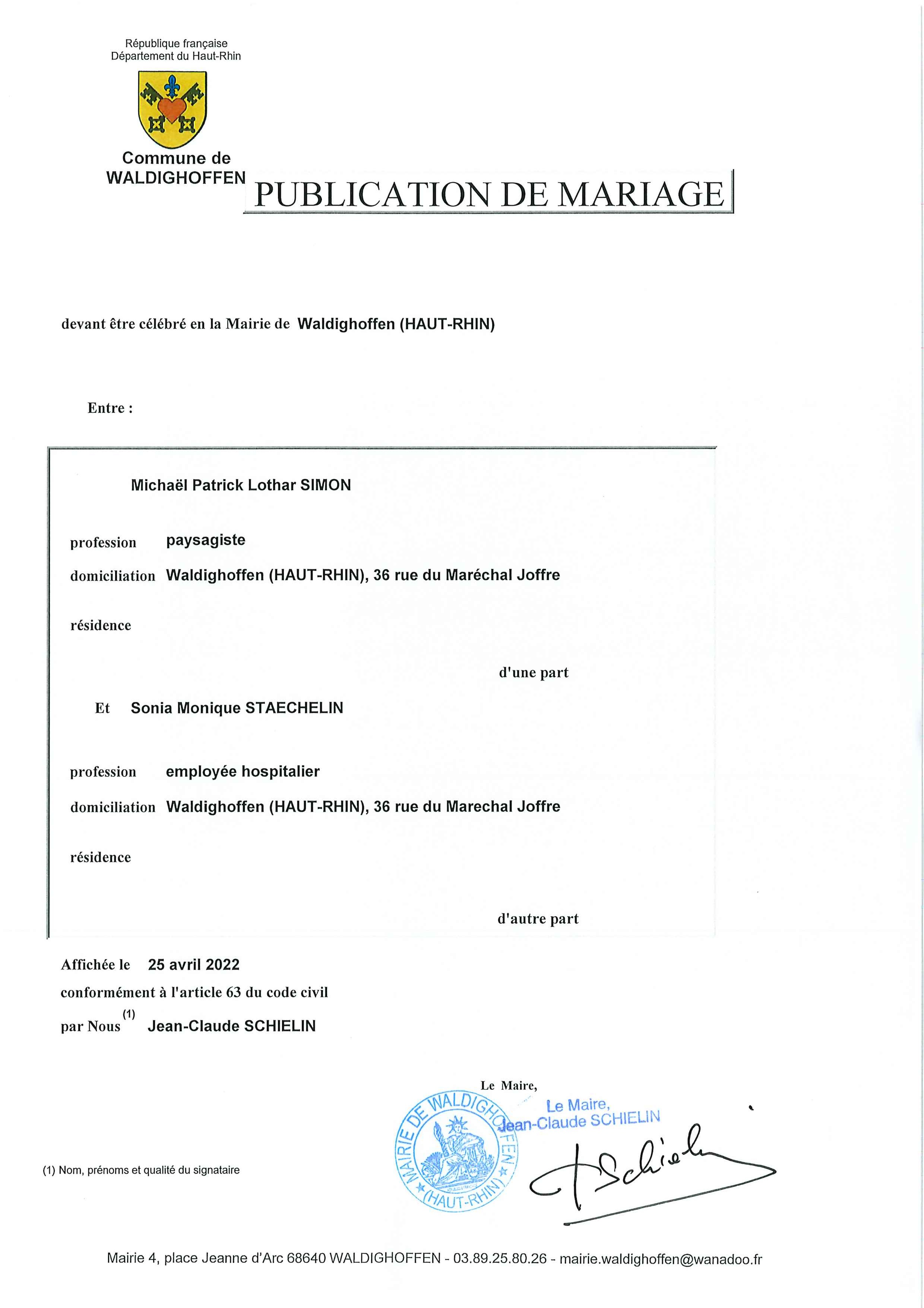 Publication de mariage entre M. Michaël SIMON et Mme Sonia STAECHELIN