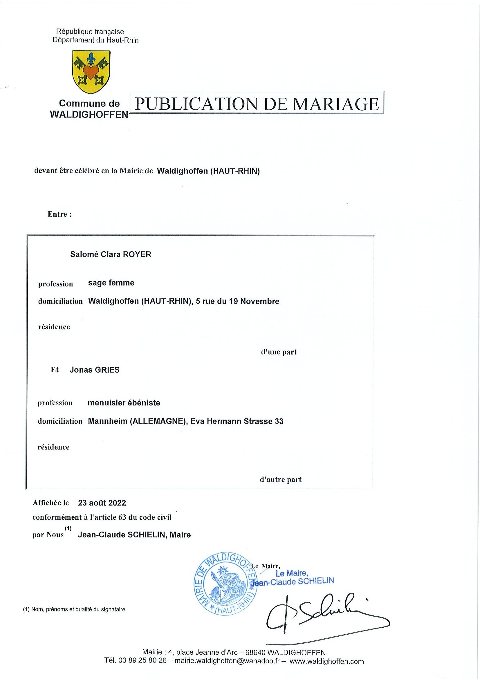 Vous êtes ici : Accueil Mairie Affichage public Annexes affichage public 2022 Publication de mariage entre Mme Salomé Royer et M. Jonas Gries