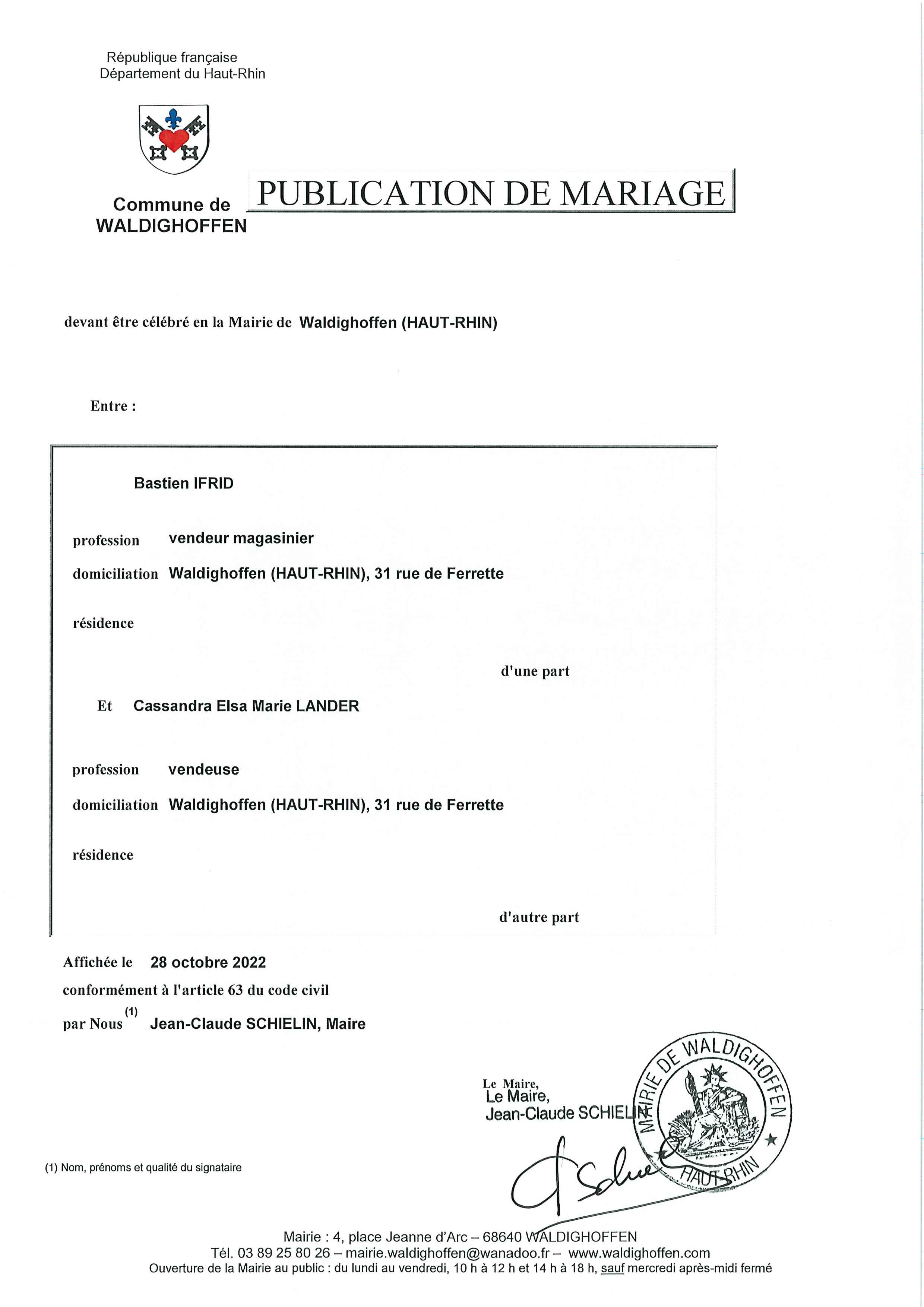 Vous êtes ici : Accueil Mairie Affichage public Annexes affichage public 2022 Publication de mariage IFRID Bastien et LANDER Cassandra