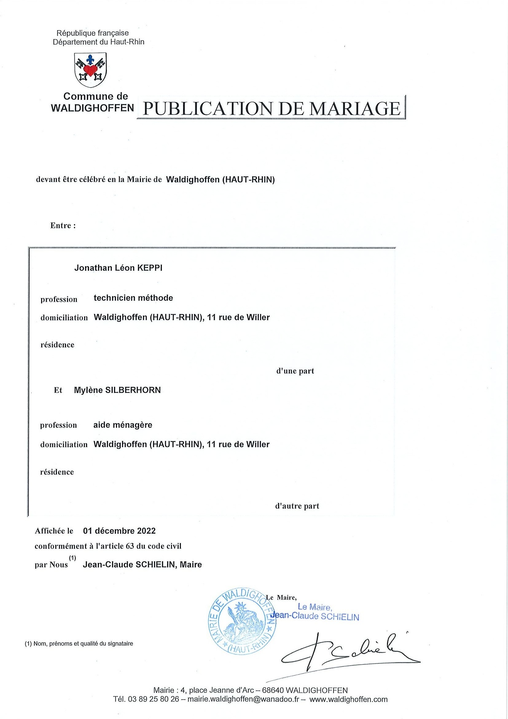Vous êtes ici : Accueil Mairie Affichage public Annexes affichage public 2022 Publication de mariage Keppi Jonathan et Silberhorn Mylène