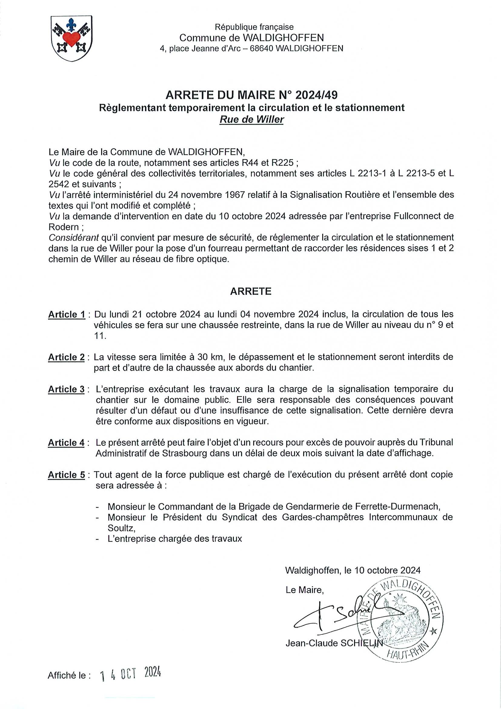 Arrêté 2024/49 réglementant la circulation rue de Willer du 21/01/2024 au 04/11/2024