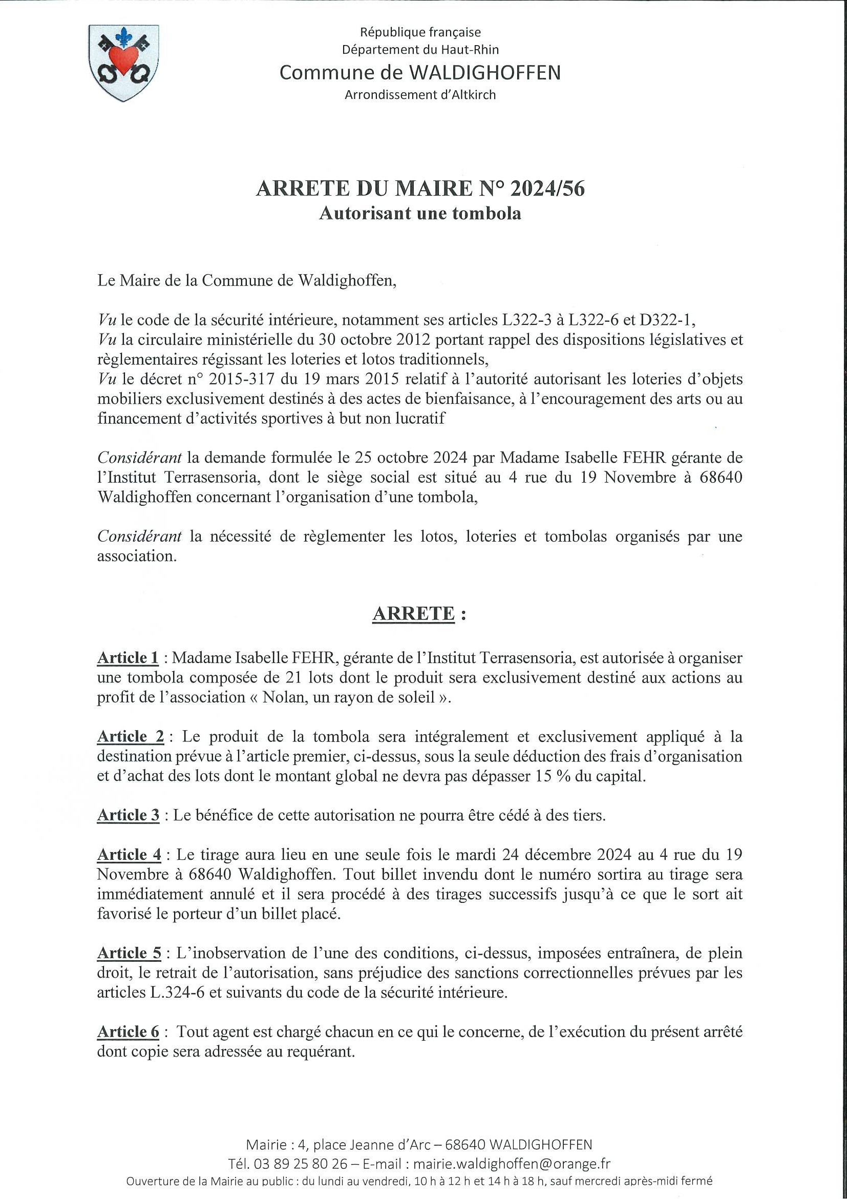 Arrêté du Maire 2024/56 autorisant une tombola - page 1