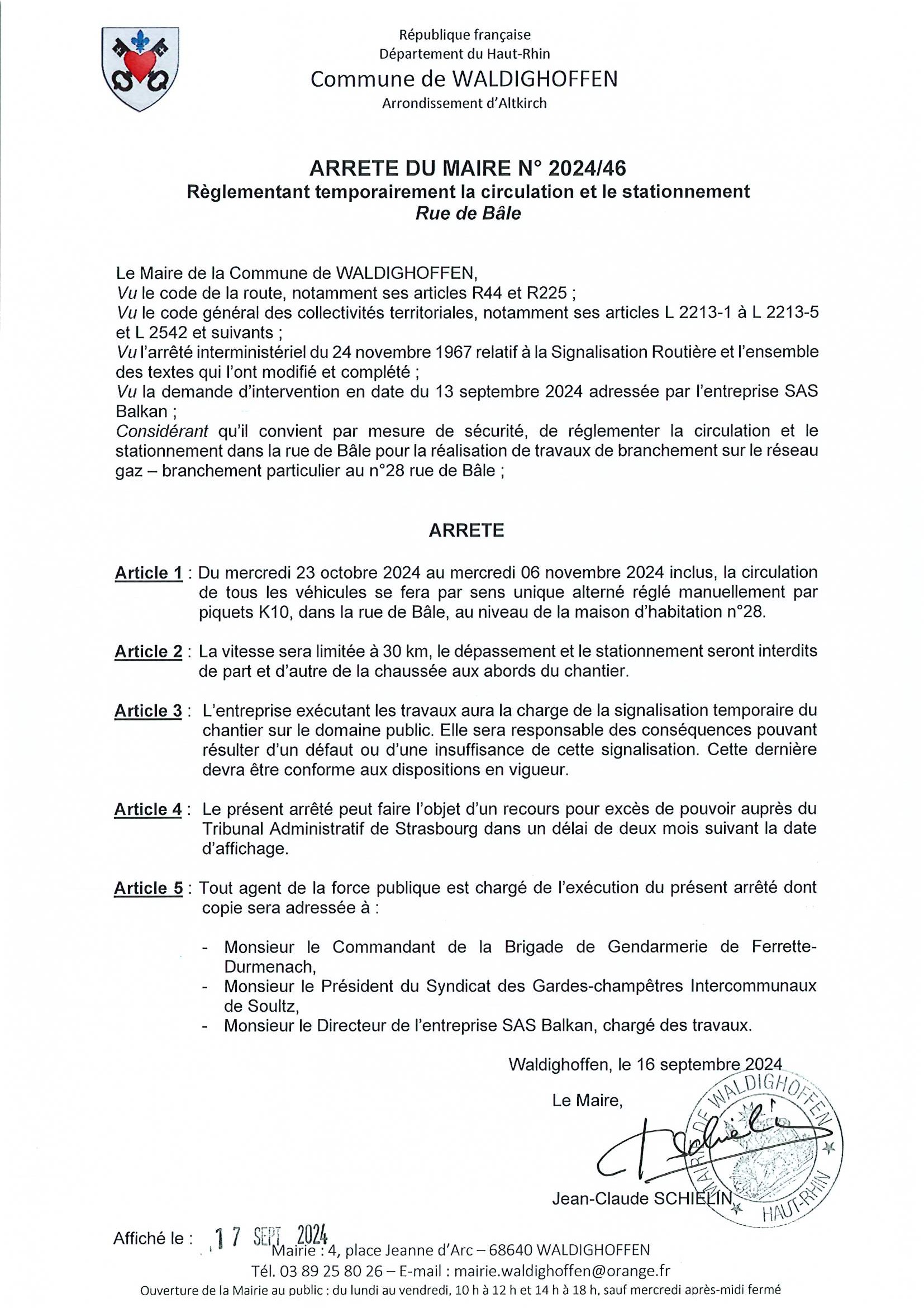 Vous êtes ici : Accueil Mairie Affichage public Annexes affichage public 2023 et 2024 Arrêté du maire n°2024/46