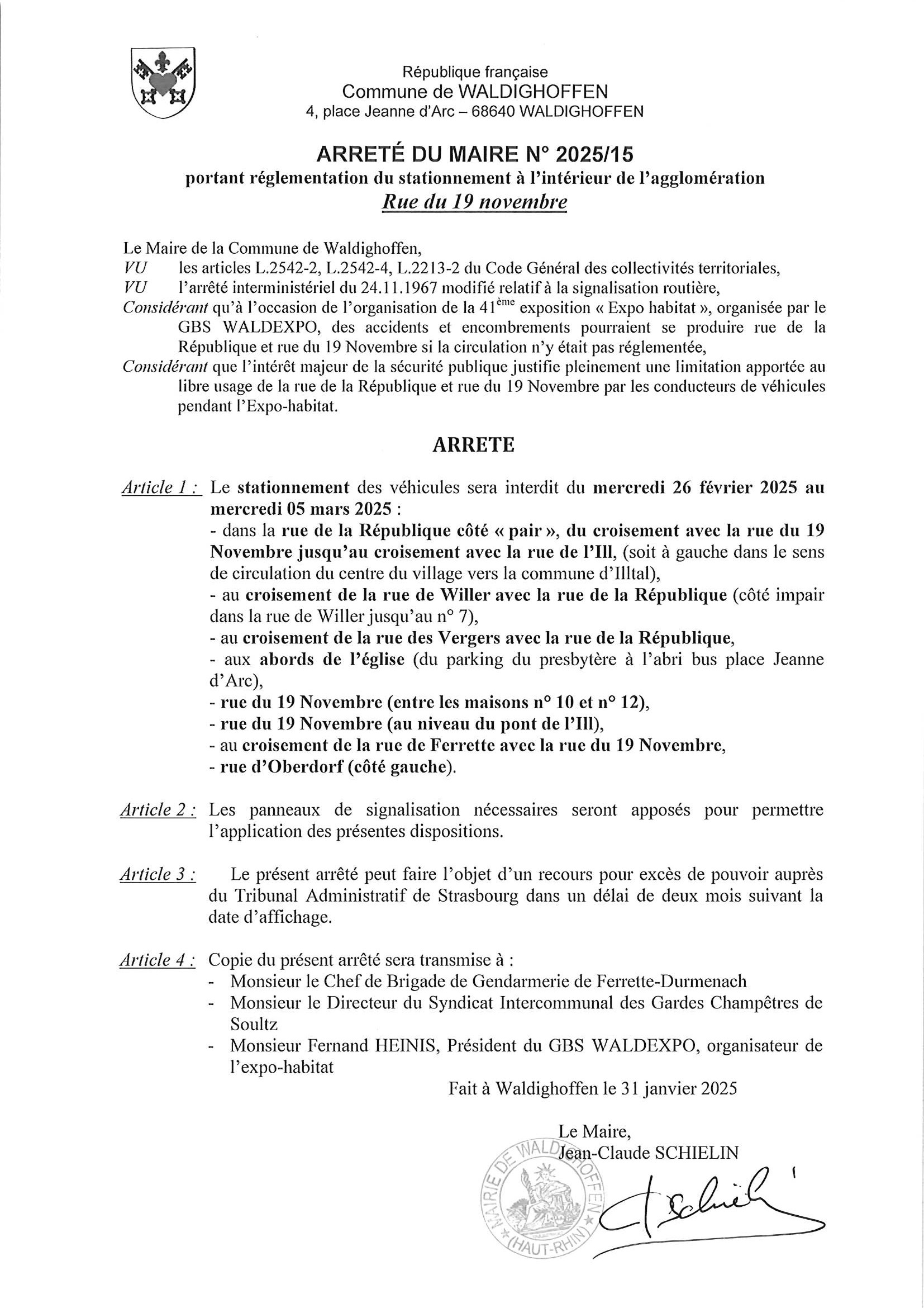 Arrêté du maire n°2025/15 Stationnement rue du 19 novembre Expo-Habitat 2025